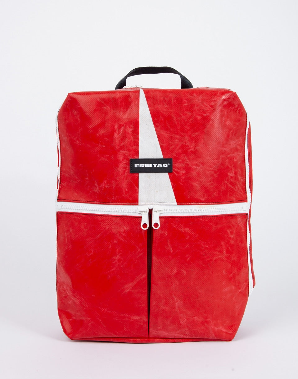 Freitag F49 Fringe - Un sac à dos fait à la main unique fait à partir de bâches de camion d'occasion et de ceintures de sécurité recyclées.