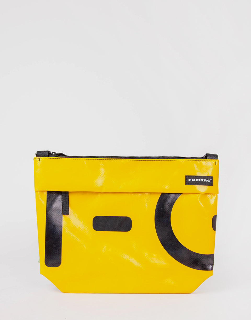 FREITAG F553 Lou - un sac bandoulière unique fabriqué à partir de bâches de camion usagées, en utilisant de vieilles ceintures de sécurité et des chambres à air de vélos, le tout coupé et cousu à la main.
