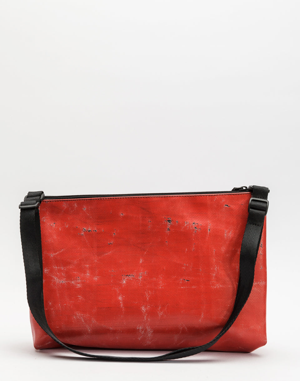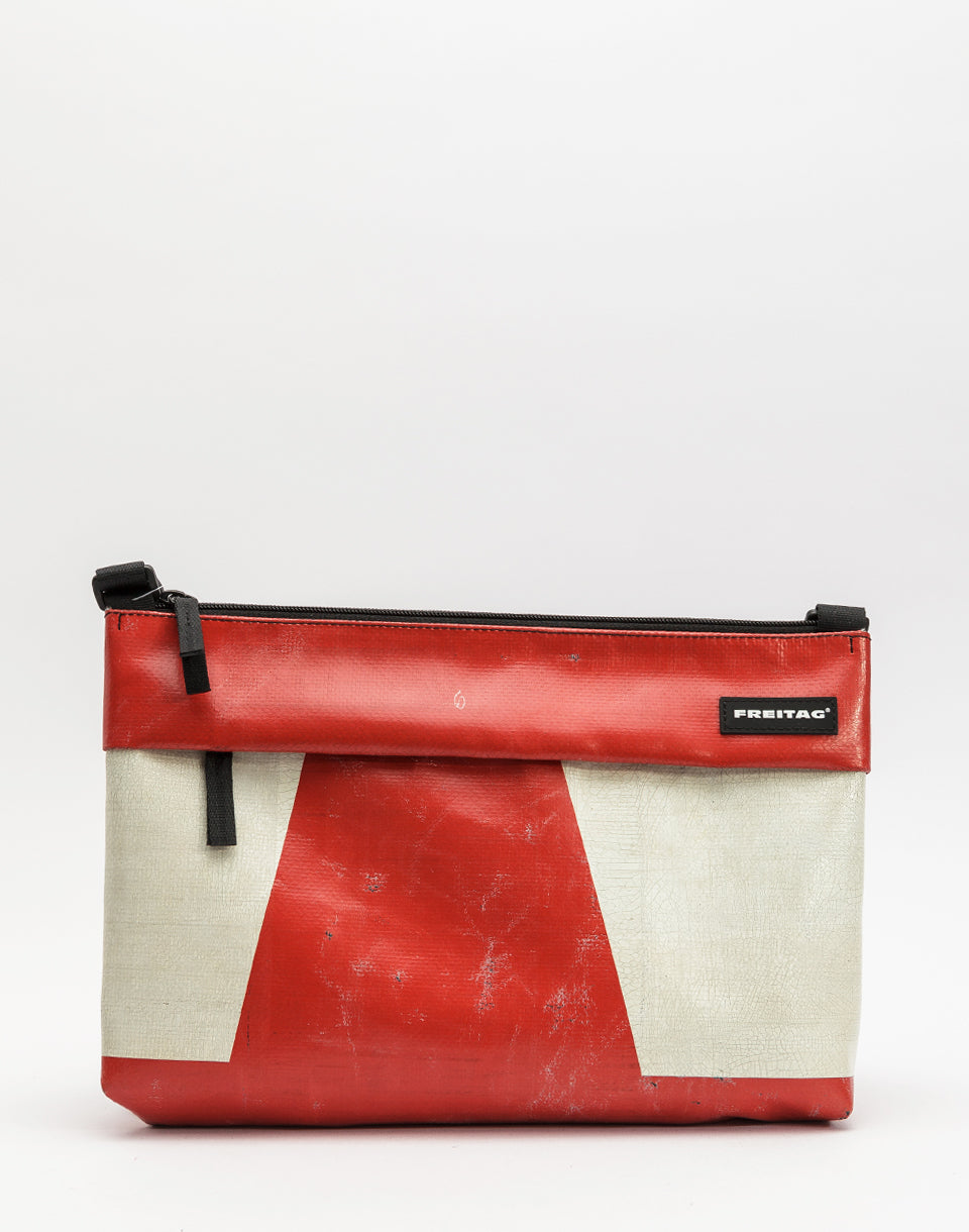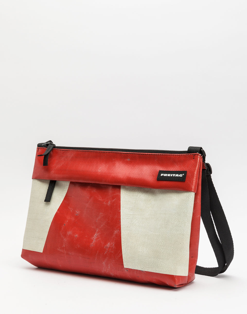 Freitag F553 Lou - Un crossbody unique à base de bâches de camion d'occasion, en utilisant de vieilles ceintures de sécurité et des tubes intérieurs de vélos, tous coupés à la main et cousus.
