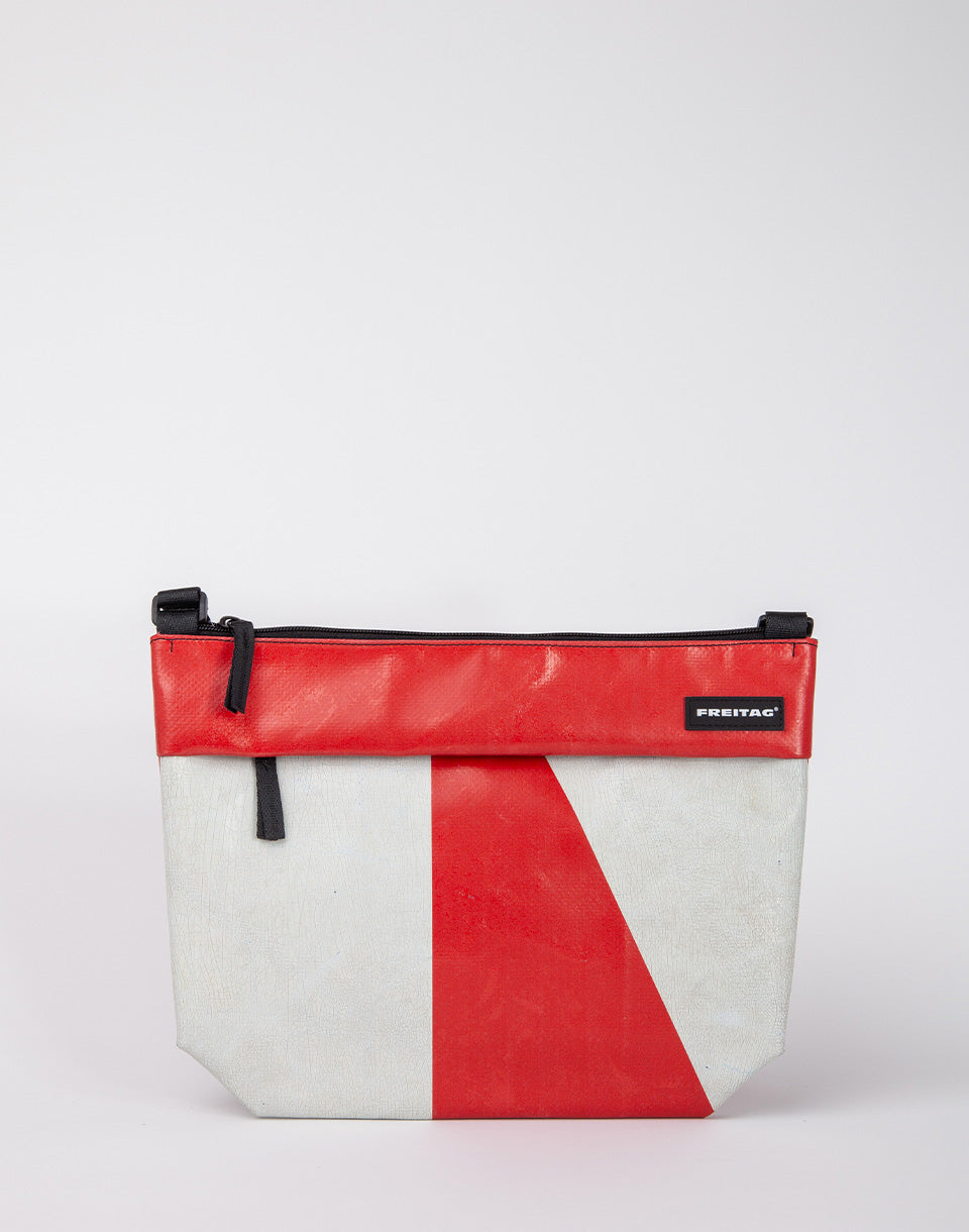 Freitag F553 Lou - Un crossbody unique à base de bâches de camion d'occasion, en utilisant de vieilles ceintures de sécurité et des tubes intérieurs de vélos, tous coupés à la main et cousus.