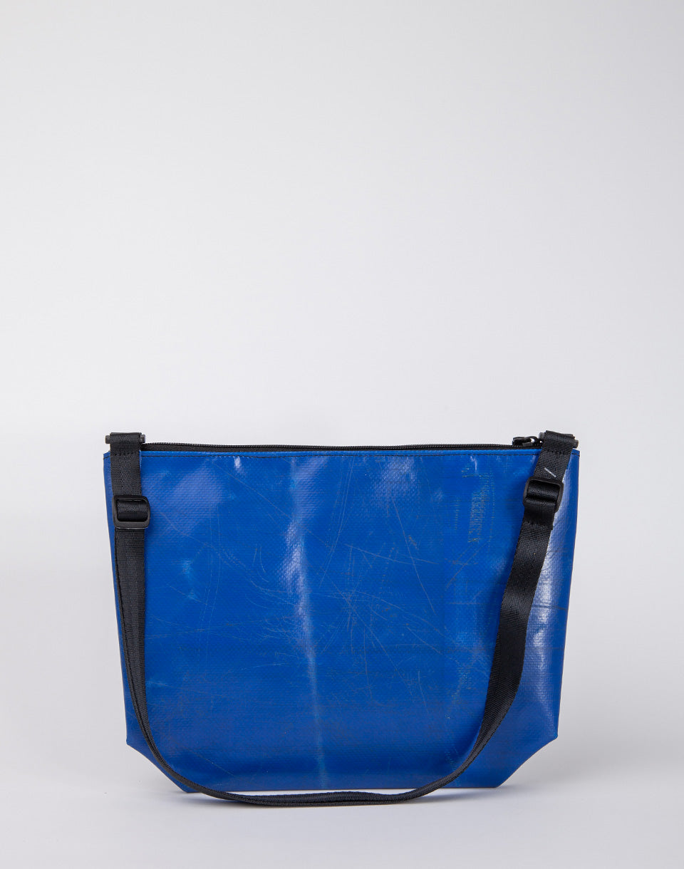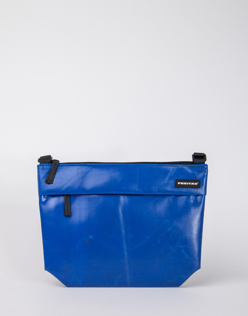 Freitag F553 Lou - Un crossbody unique à base de bâches de camion d'occasion, en utilisant de vieilles ceintures de sécurité et des tubes intérieurs de vélos, tous coupés à la main et cousus.