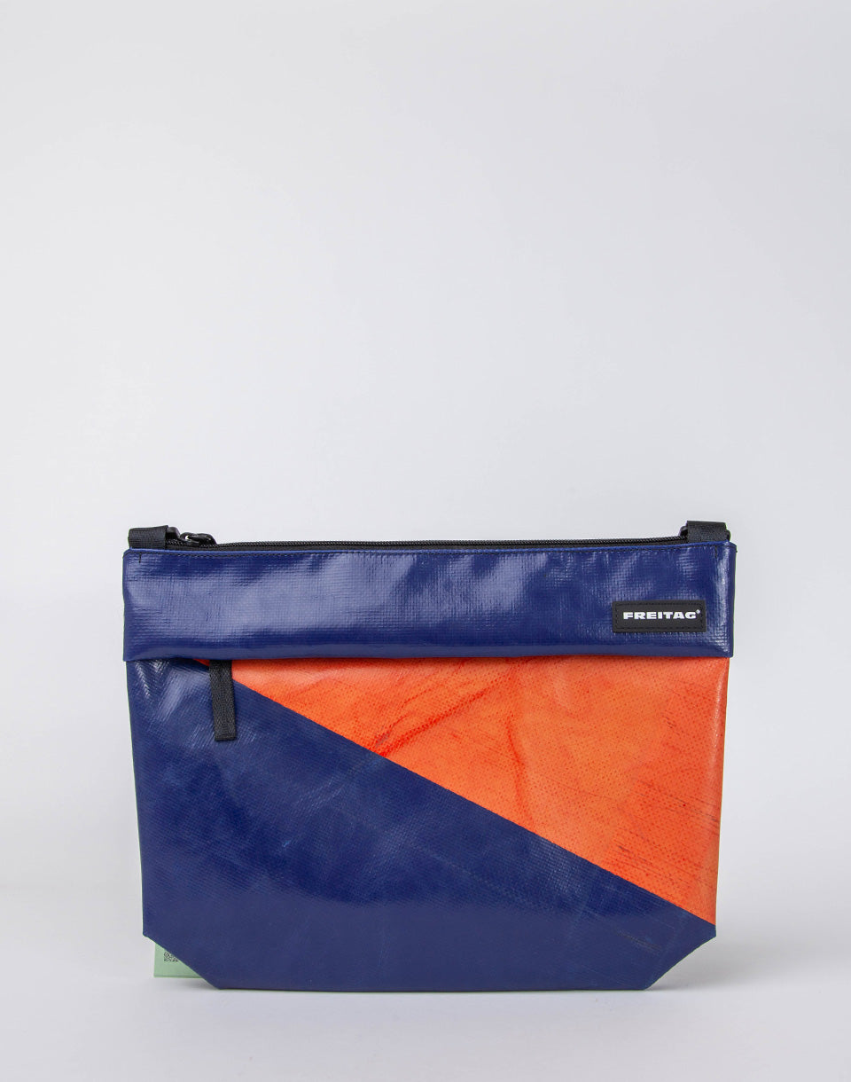 Freitag F553 Lou - Un crossbody unique à base de bâches de camion d'occasion, en utilisant de vieilles ceintures de sécurité et des tubes intérieurs de vélos, tous coupés à la main et cousus.