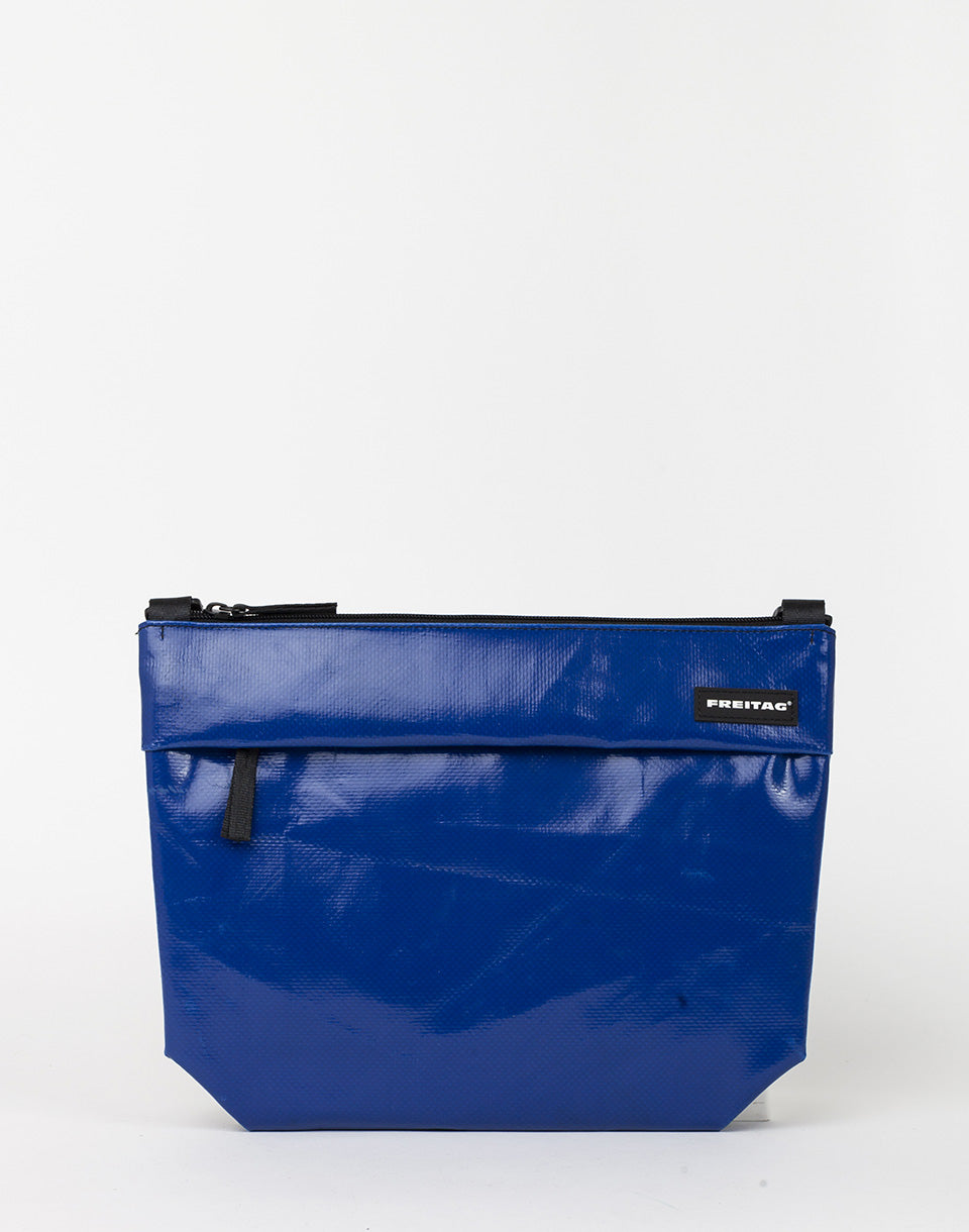 Freitag F553 Lou - Un crossbody unique à base de bâches de camion d'occasion, en utilisant de vieilles ceintures de sécurité et des tubes intérieurs de vélos, tous coupés à la main et cousus.