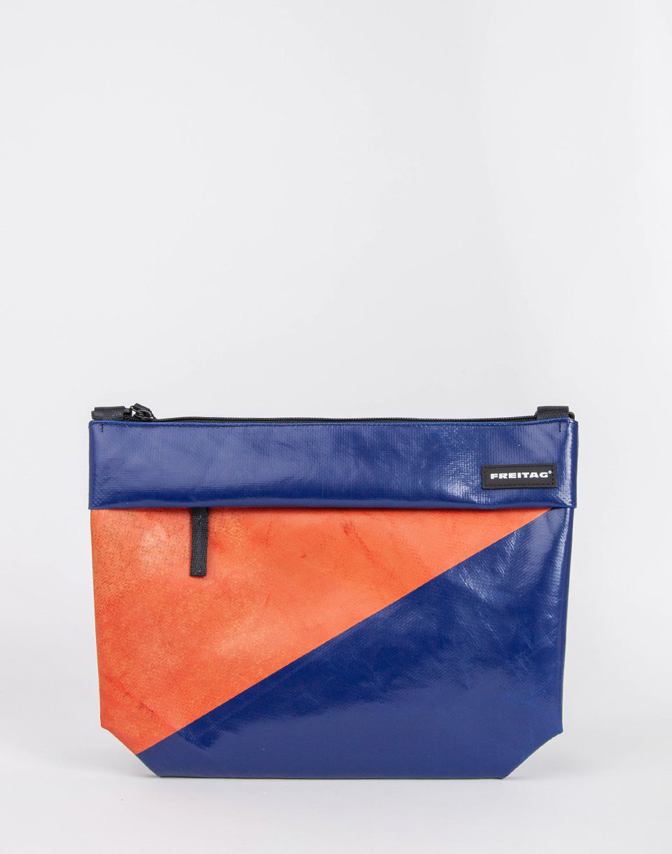 Freitag F553 Lou - Un crossbody unique à base de bâches de camion d'occasion, en utilisant de vieilles ceintures de sécurité et des tubes intérieurs de vélos, tous coupés à la main et cousus.