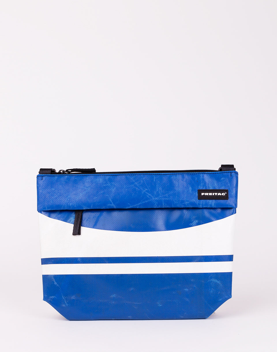 Freitag F553 Lou - Un crossbody unique à base de bâches de camion d'occasion, en utilisant de vieilles ceintures de sécurité et des tubes intérieurs de vélos, tous coupés à la main et cousus.