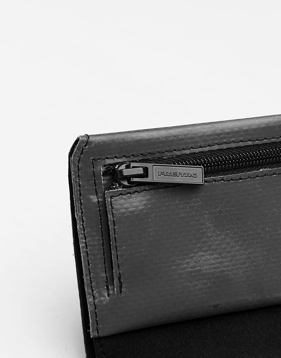 Freitag F558 Leonard - Un portefeuille pliant simple avec un compartiment de pièces et un espace pour vos cartes. De plus, il est fabriqué à partir de bâches de camions d'occasion, ce qui fait que chaque portefeuille produit une pièce complètement unique.