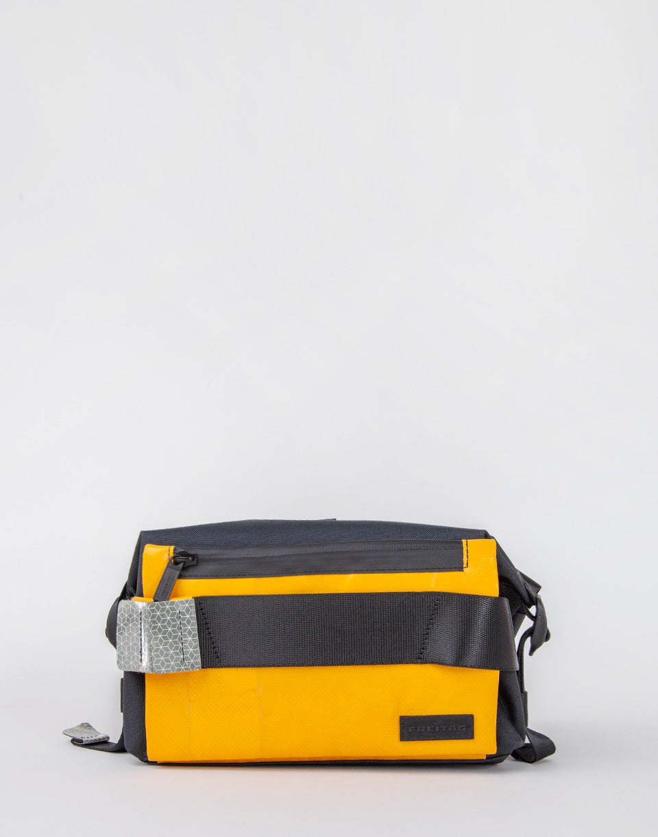 Freitag F670 Warren - sac à bandoulière réfléchissant et unique avec bandoulière réglable, qui peut être porté comme un rein plus grand. Il est fabriqué à partir de bouteilles d'animaux recyclées et avec des parties de voiles de camion à la retraite, y compris des marques de réflexion recyclées.