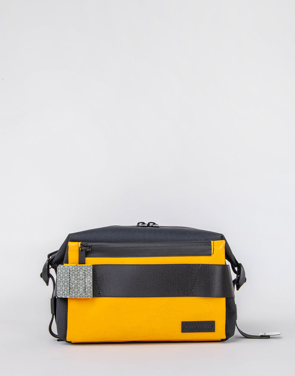 Freitag F670 Warren - sac à bandoulière réfléchissant et unique avec bandoulière réglable, qui peut être porté comme un rein plus grand. Il est fabriqué à partir de bouteilles d'animaux recyclées et avec des parties de voiles de camion à la retraite, y compris des marques de réflexion recyclées.