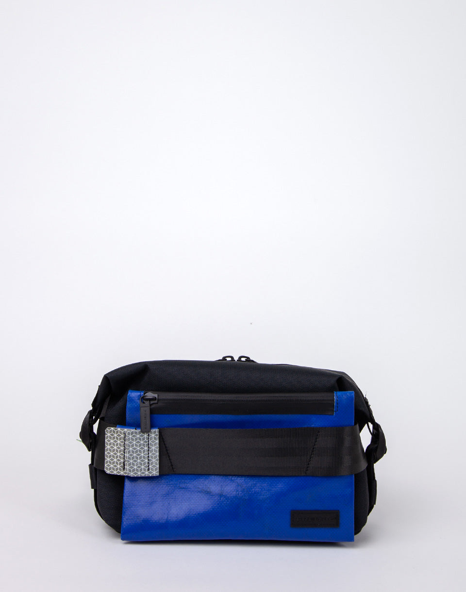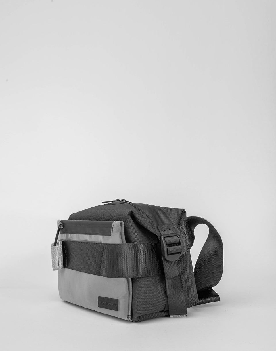 Freitag F670 Warren - sac à bandoulière réfléchissant et unique avec bandoulière réglable, qui peut être porté comme un rein plus grand. Il est fabriqué à partir de bouteilles d'animaux recyclées et avec des parties de voiles de camion à la retraite, y compris des marques de réflexion recyclées.