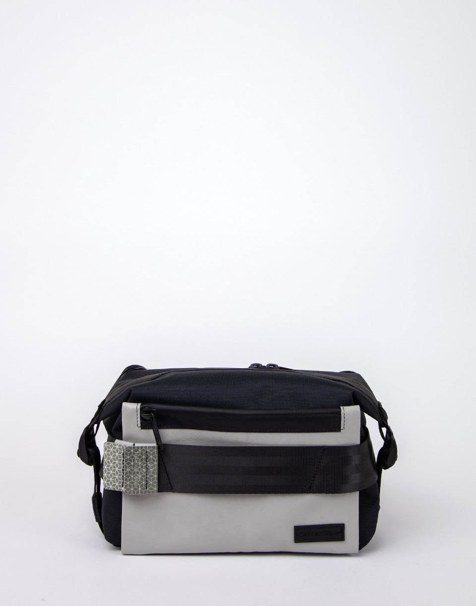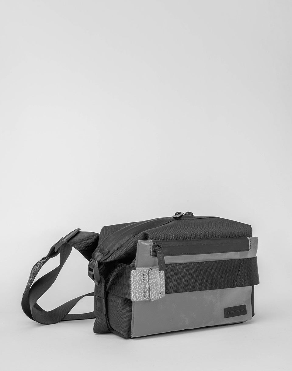 Freitag F670 Warren - sac à bandoulière réfléchissant et unique avec bandoulière réglable, qui peut être porté comme un rein plus grand. Il est fabriqué à partir de bouteilles d'animaux recyclées et avec des parties de voiles de camion à la retraite, y compris des marques de réflexion recyclées.
