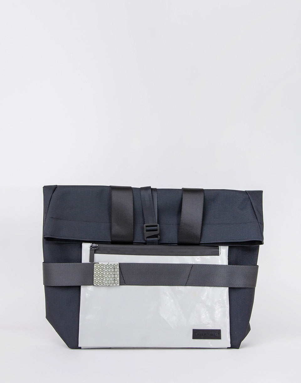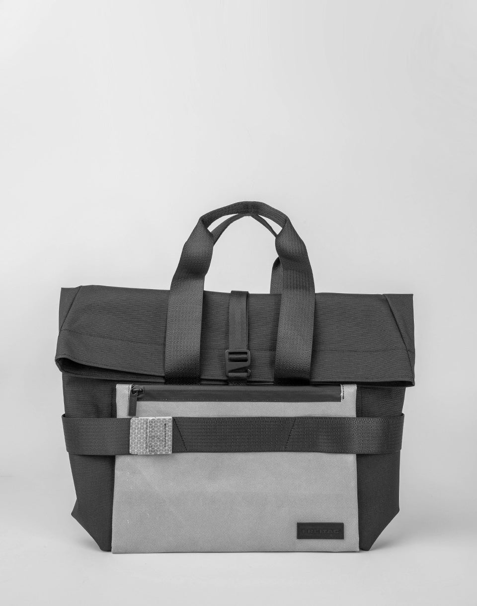 Freitag F680 Anderson - Sac extensible avec bandoulière réglable qui peut être transportée dans la main sous forme de sac fourre-tout. Il est fabriqué à partir de bouteilles d'animaux recyclées et avec des parties de voiles de camion à la retraite, y compris des marques réfléchissantes recyclées.