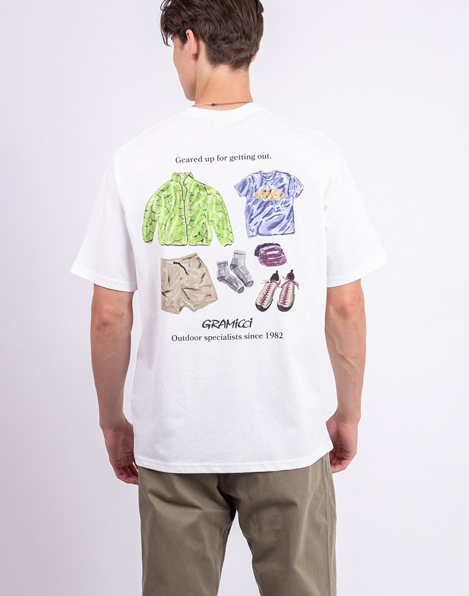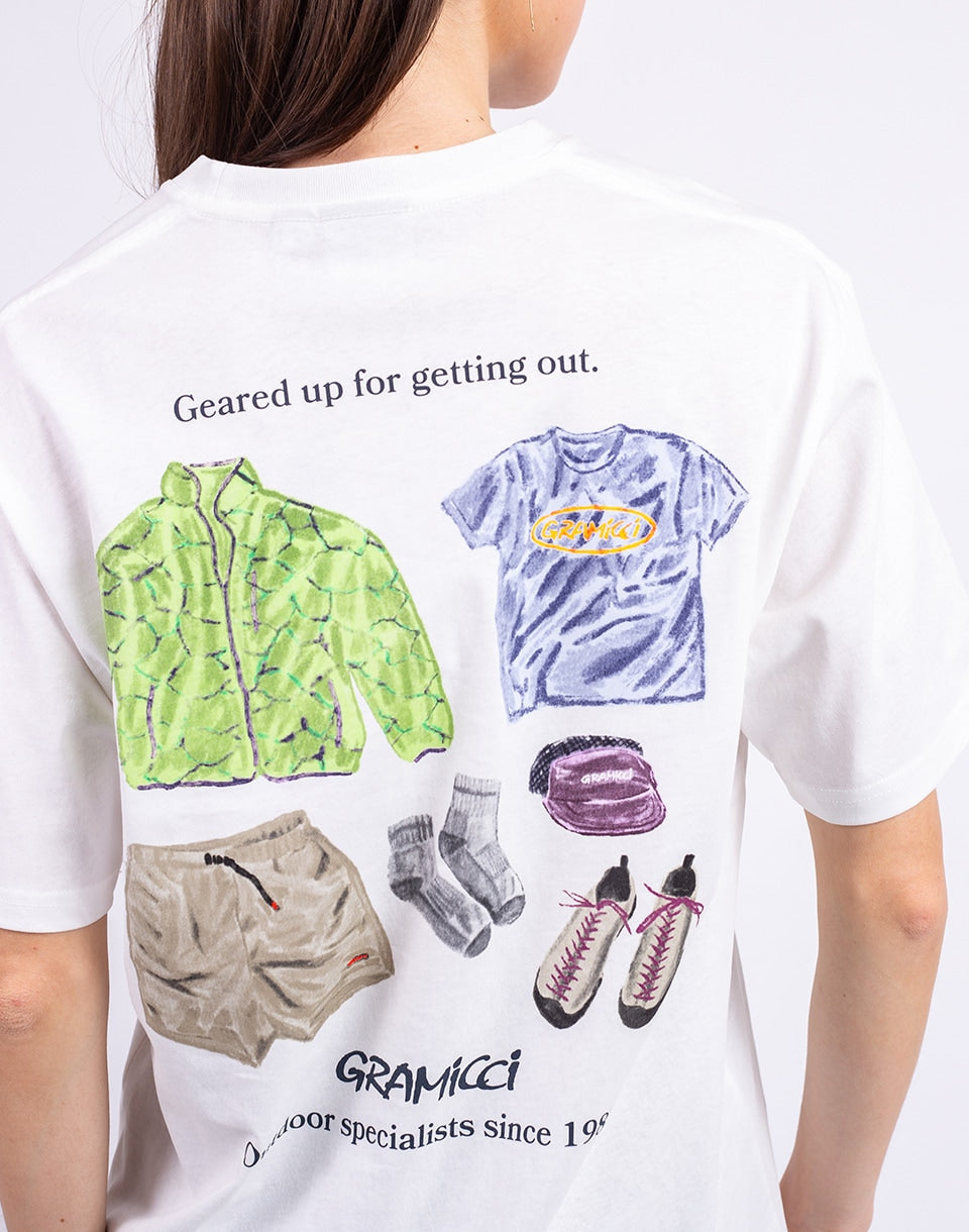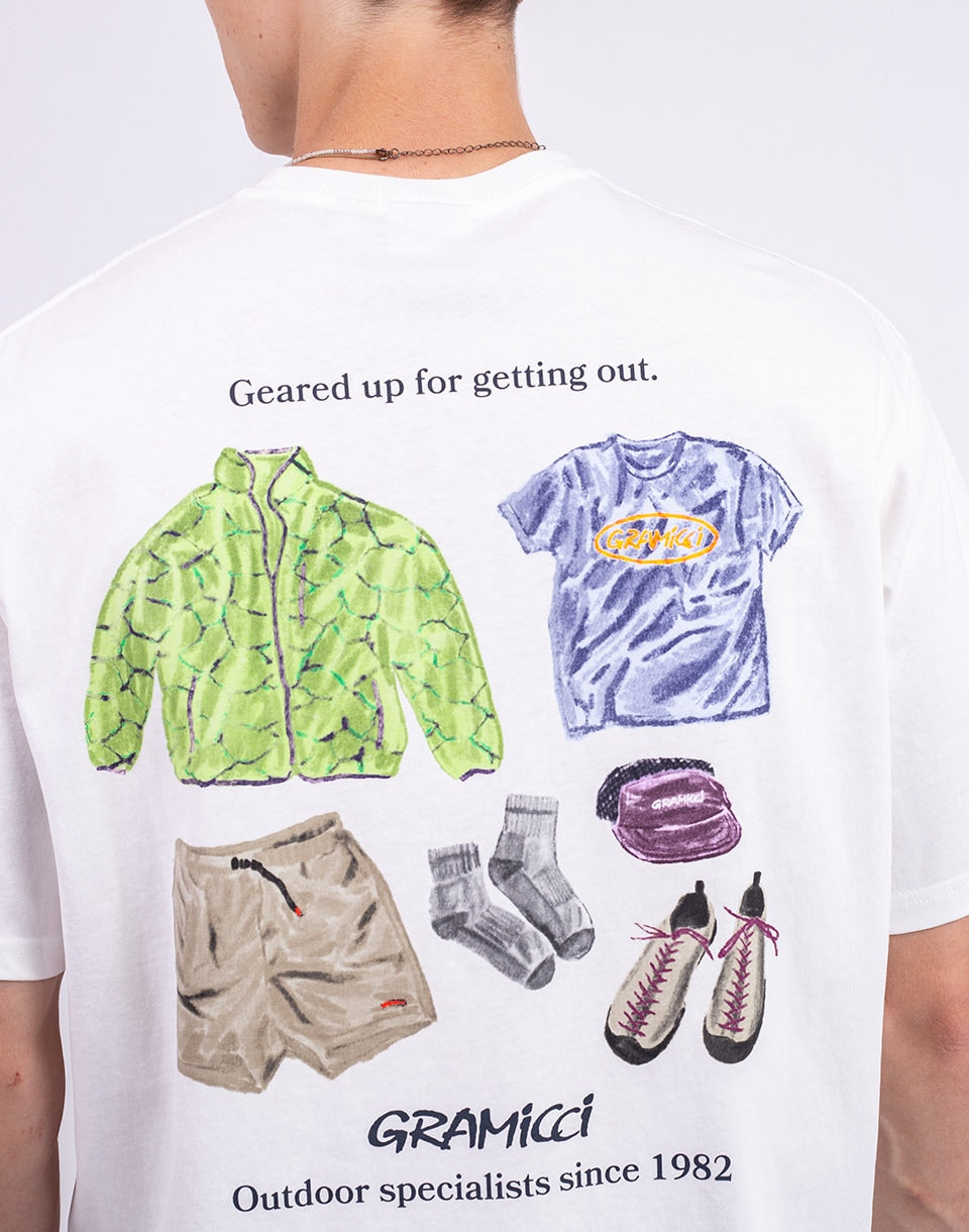 Le t-shirt Gramicci Geared Up est un t-shirt en coton écologique qui présente un graphique d'équipement d'alpinisme au dos.