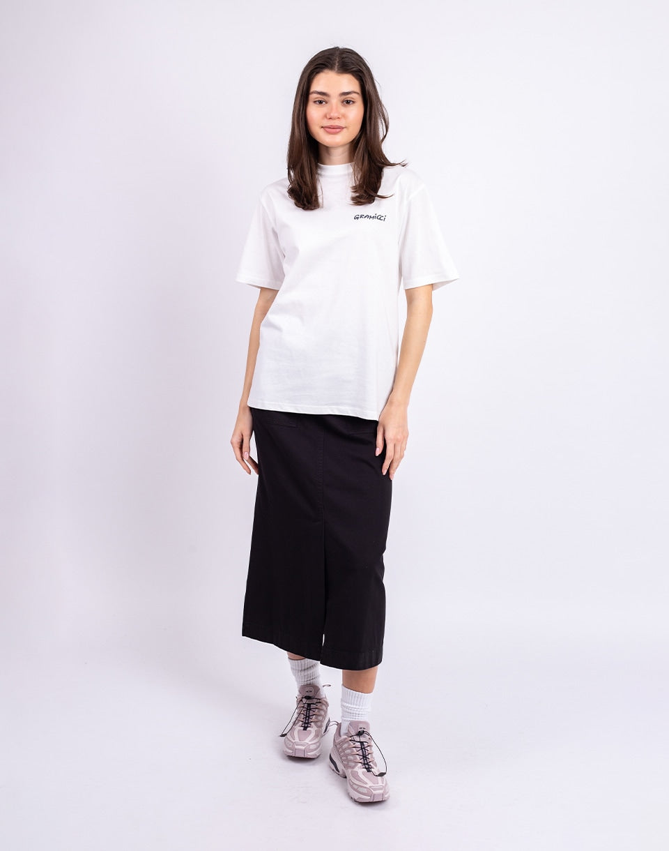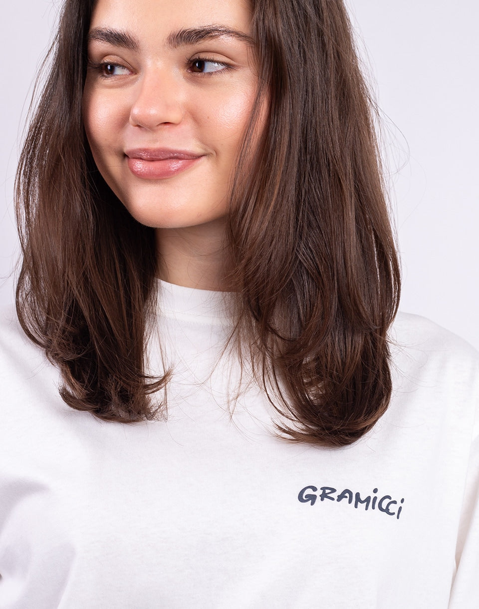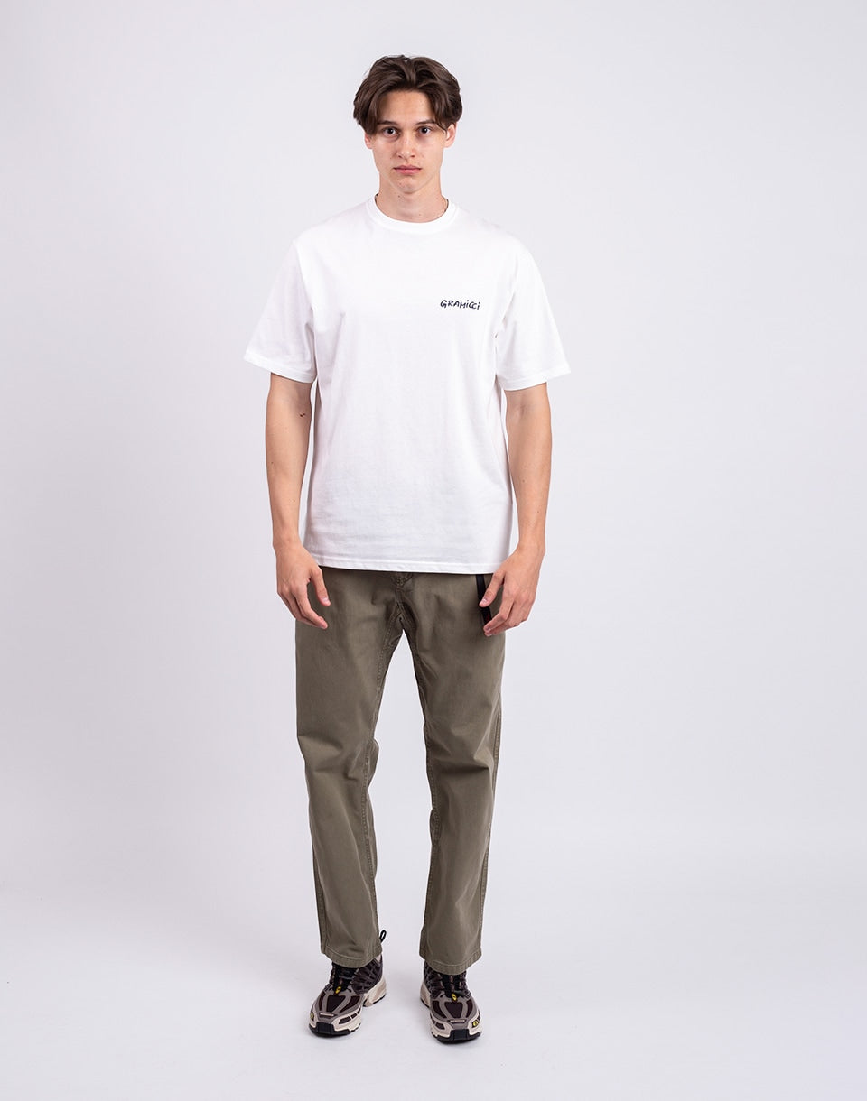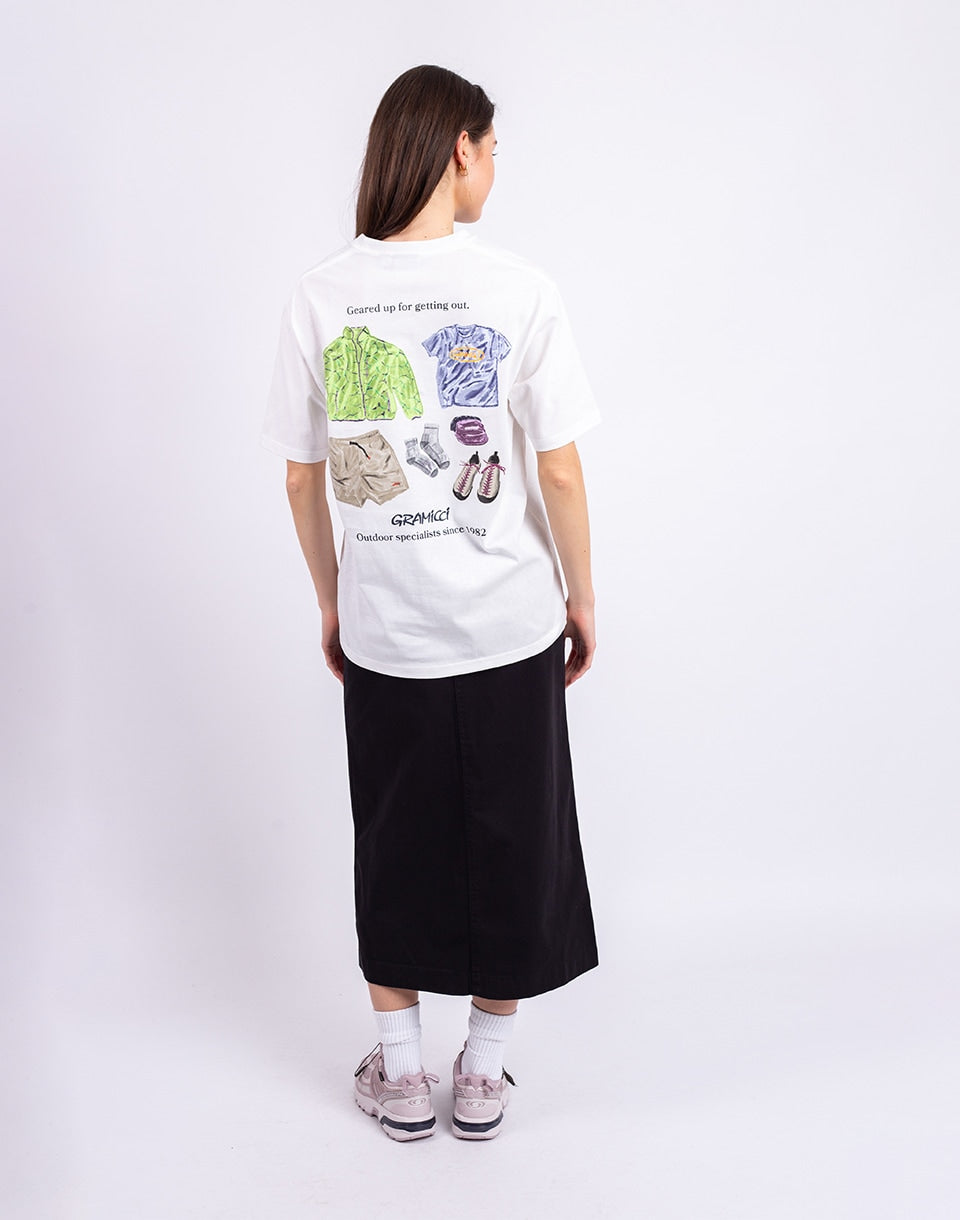 Le t-shirt Gramicci Geared Up est un t-shirt en coton écologique qui présente un graphique d'équipement d'alpinisme au dos.