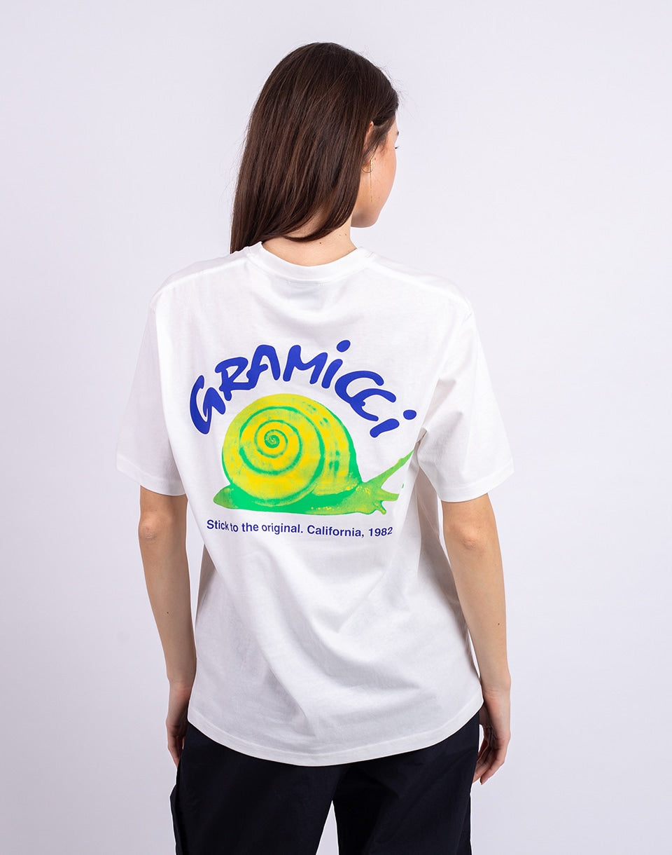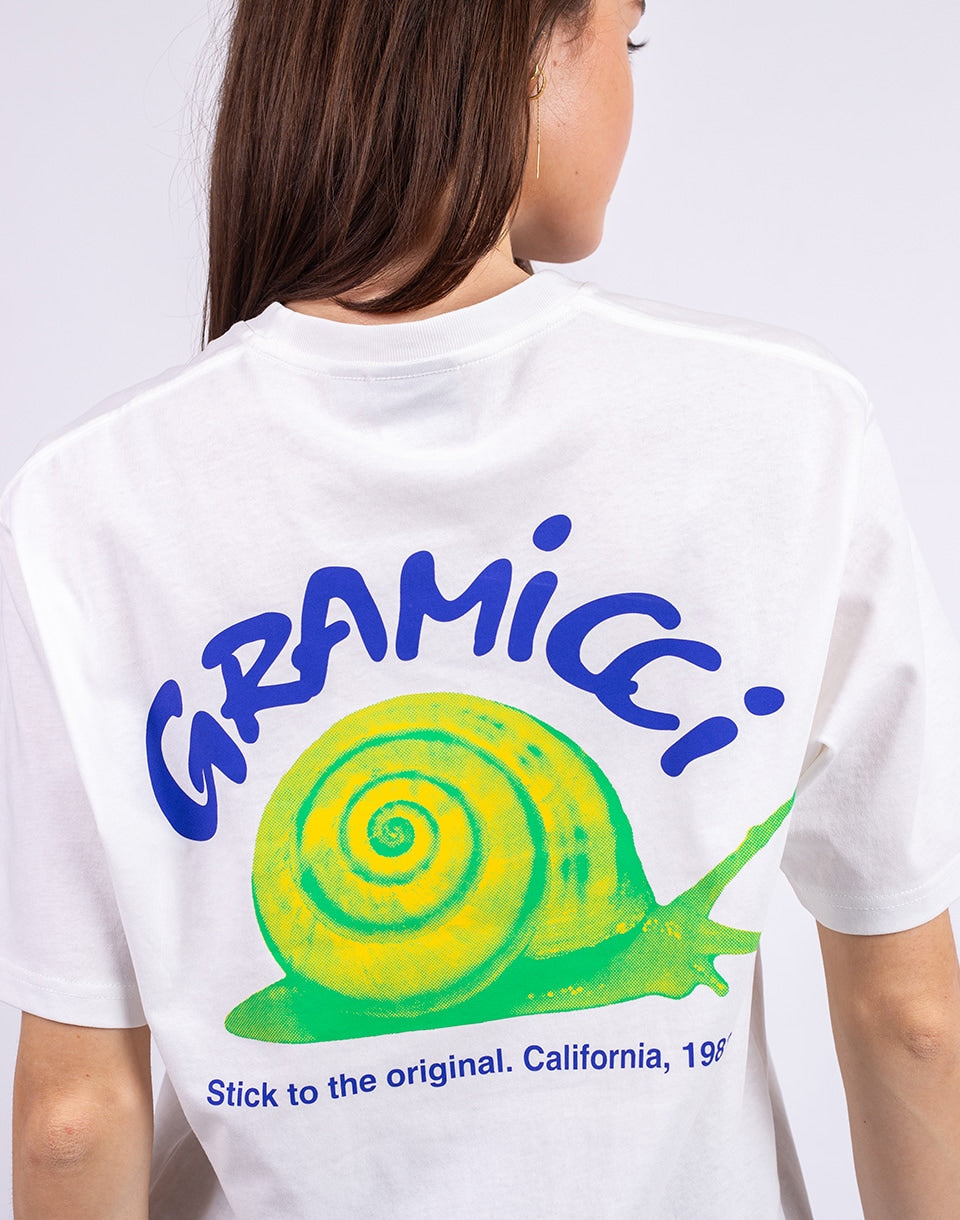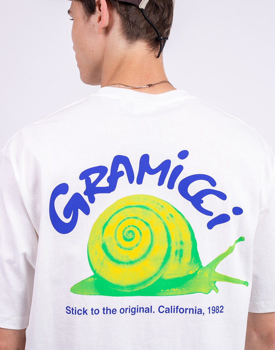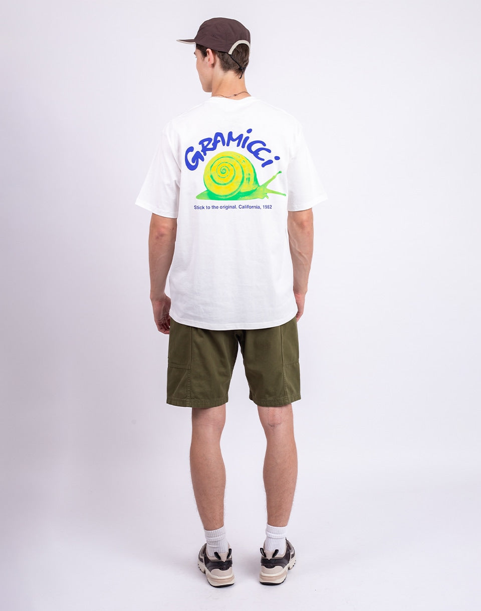 Gramicci Snail Tee - T-shirt avec un imprimé graphique cool au dos en coton biologique.