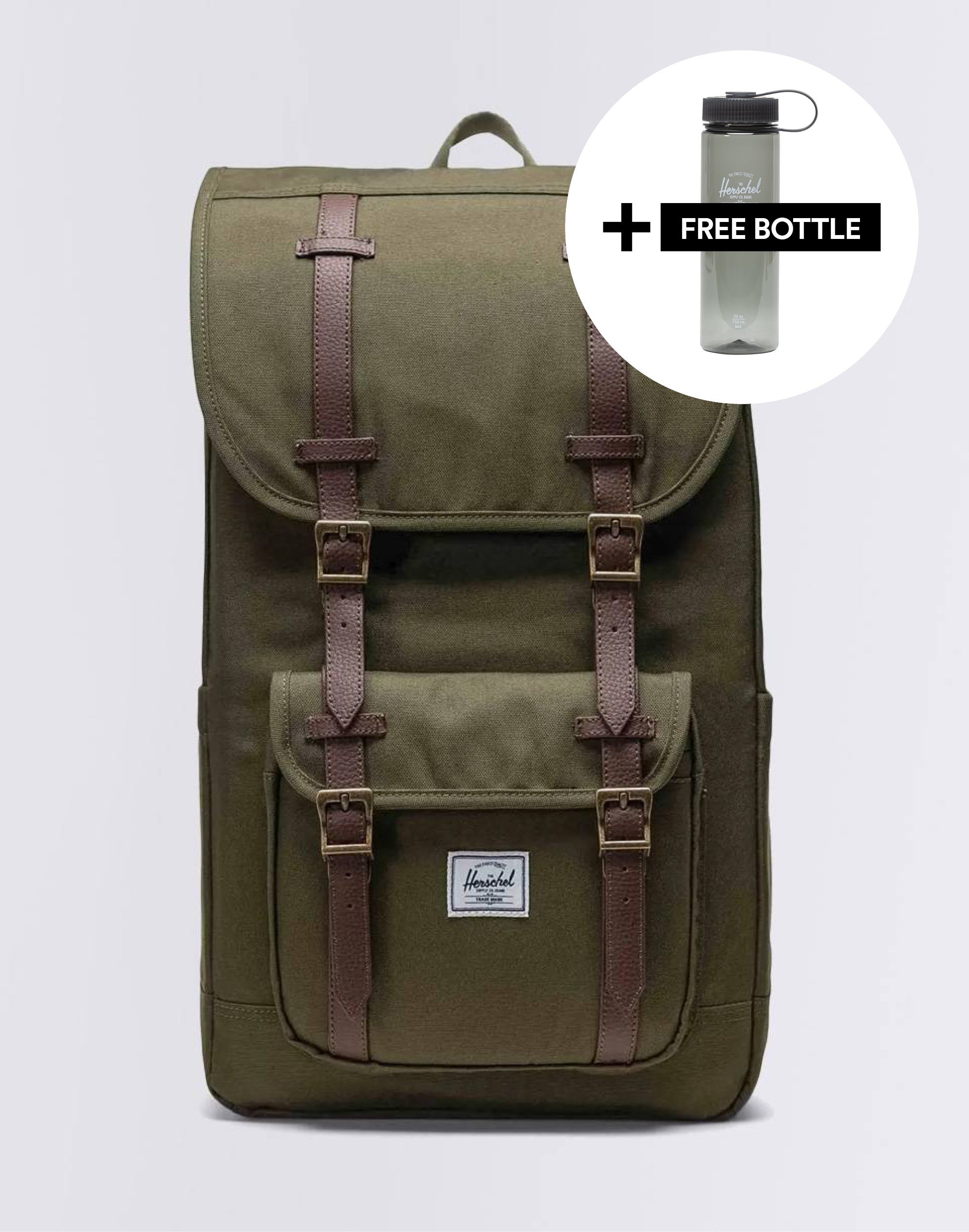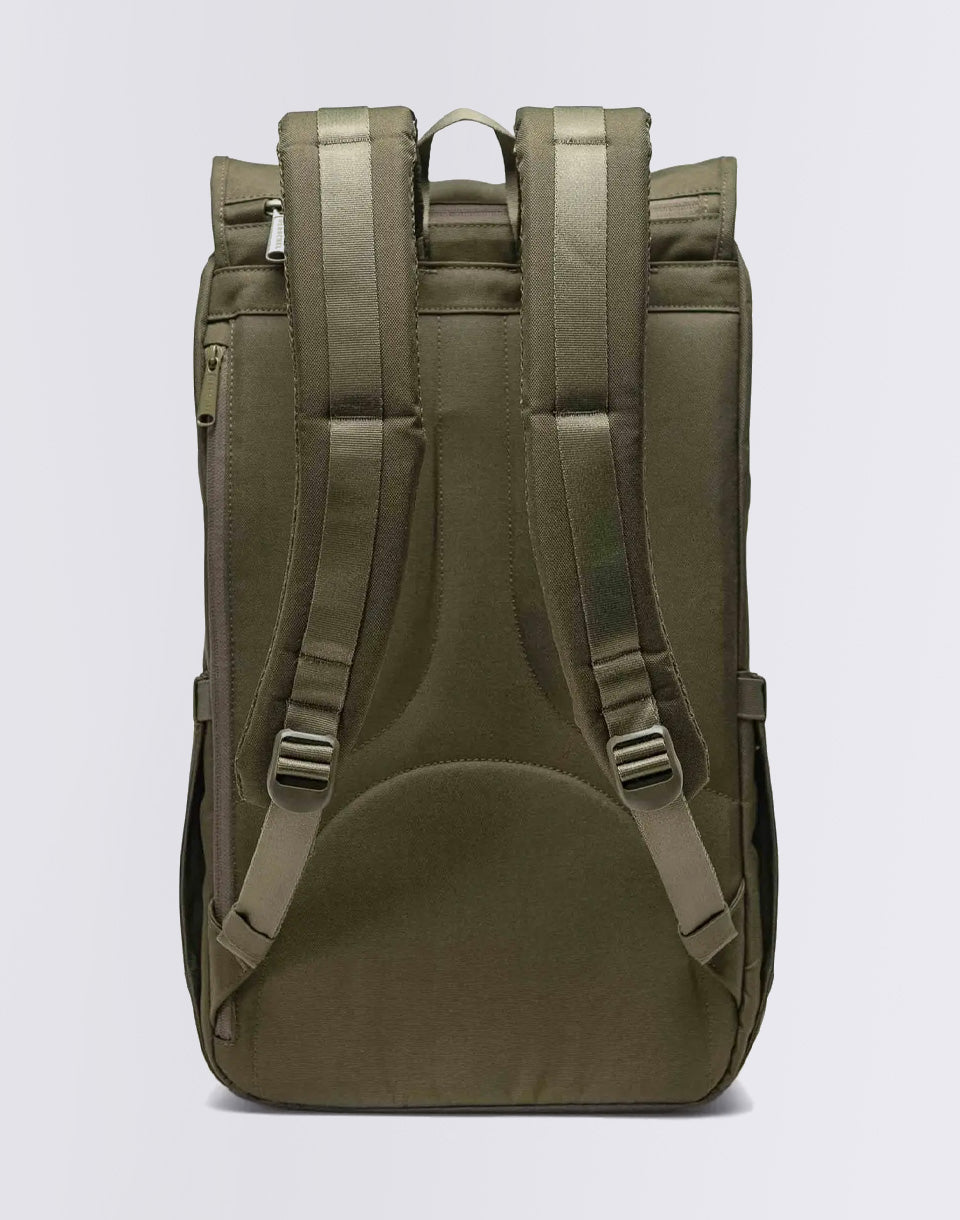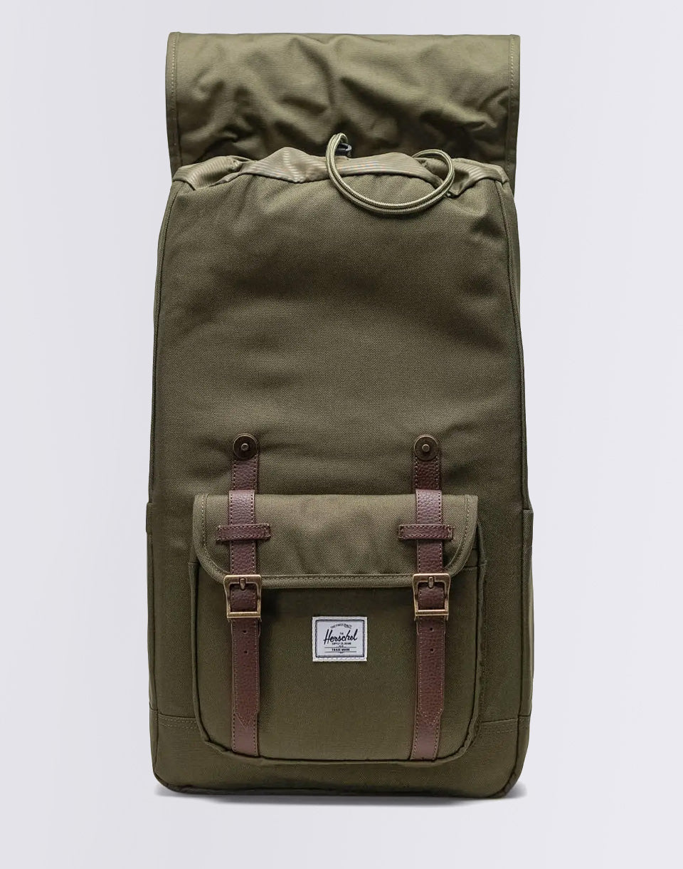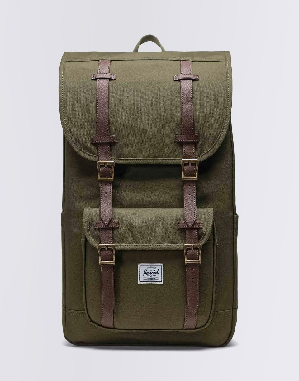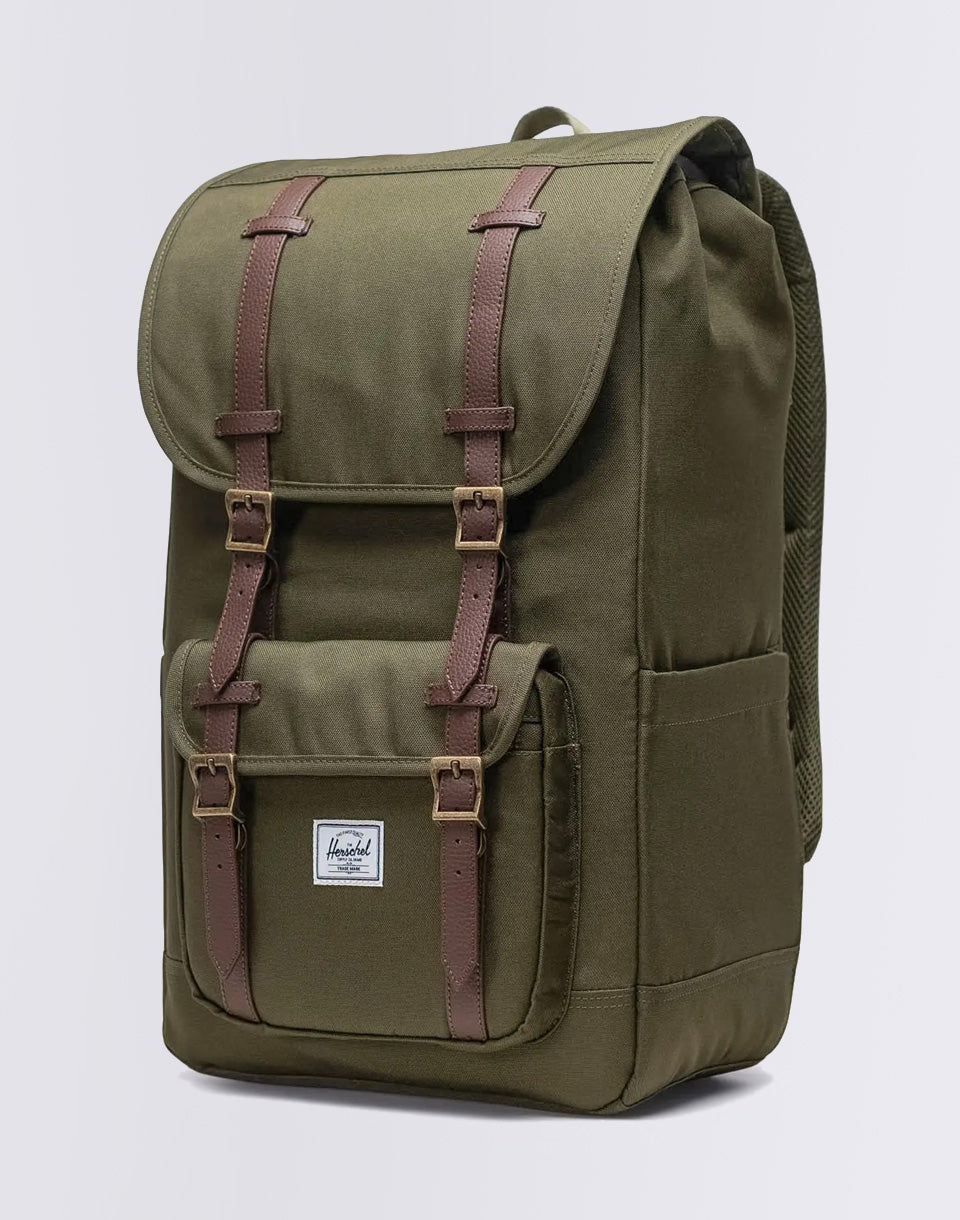 Herschel fournit Little America - un sac à dos urbain polyvalent fabriqué à partir de matériaux recyclés Ecosystem ™ fabriqués à partir de bouteilles d'animaux de compagnie 100% recyclées qui offre une manche en toison rembourrée pour un ordinateur portable de 15 "/ 16" en plus d'un design propre.