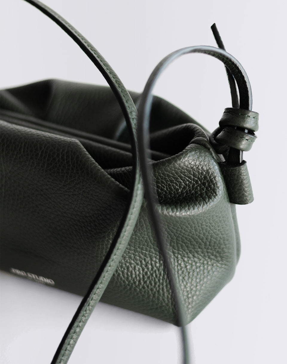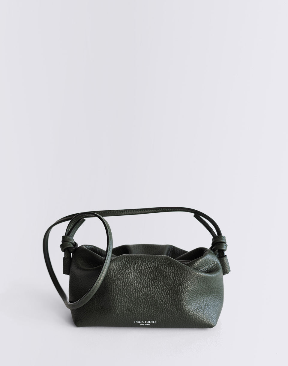 PBG Embrayage Mini - Un petit sac à main élégant en cuir souple doublé de coton biologique, avec un logo imprimé en argent et un fermoir magnétique.