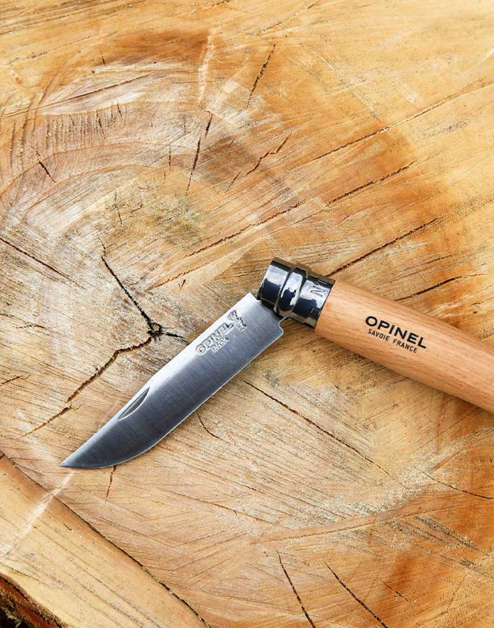 Opinel n ° 08 Inox + gaine - couteau de fermeture léger de l'opinion traditionnelle de la marque française avec poignée en hêtre et gaine en cuir, parfaite pour vos voyages.