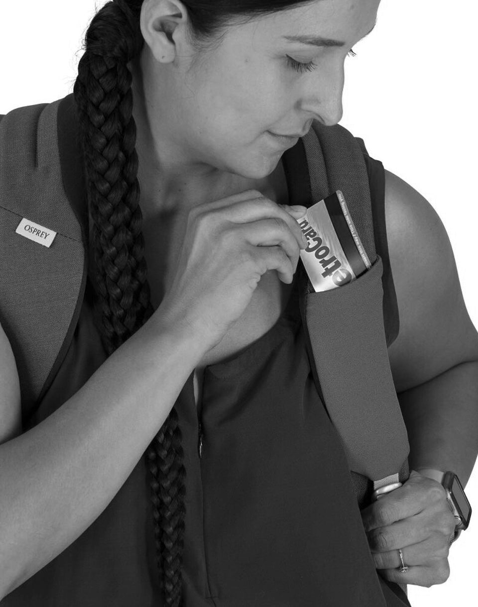 • Flexible mesh pocket on shoulder strap for cards or small items
