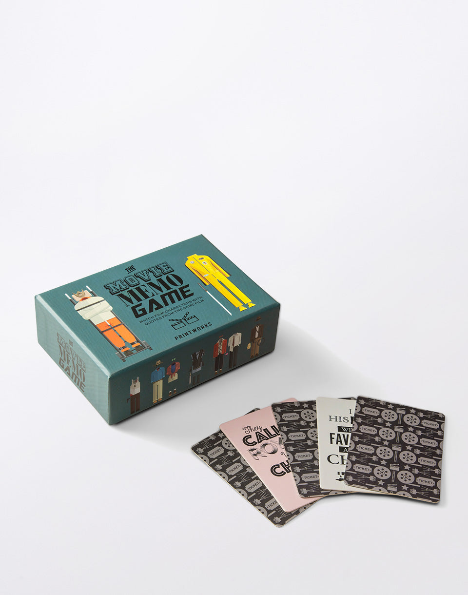 Jeu de notes de mémo imprimants - film - un jeu de mémoire qui testera vos connaissances des films classiques. Le jeu propose 25 costumes de personnages de films mémorables et de lignes célèbres de leurs films.