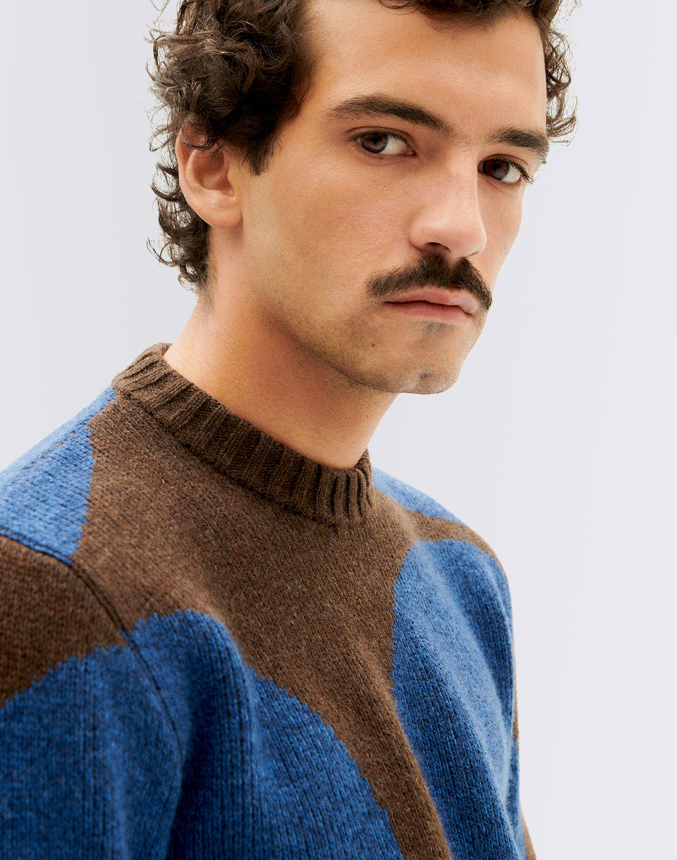 Pensant Mu Dots Blue Khem Knited Knited Pull - Un pull d'échange équitable en laine supplémentaire, soutenue par une marque durable d'Espagne.