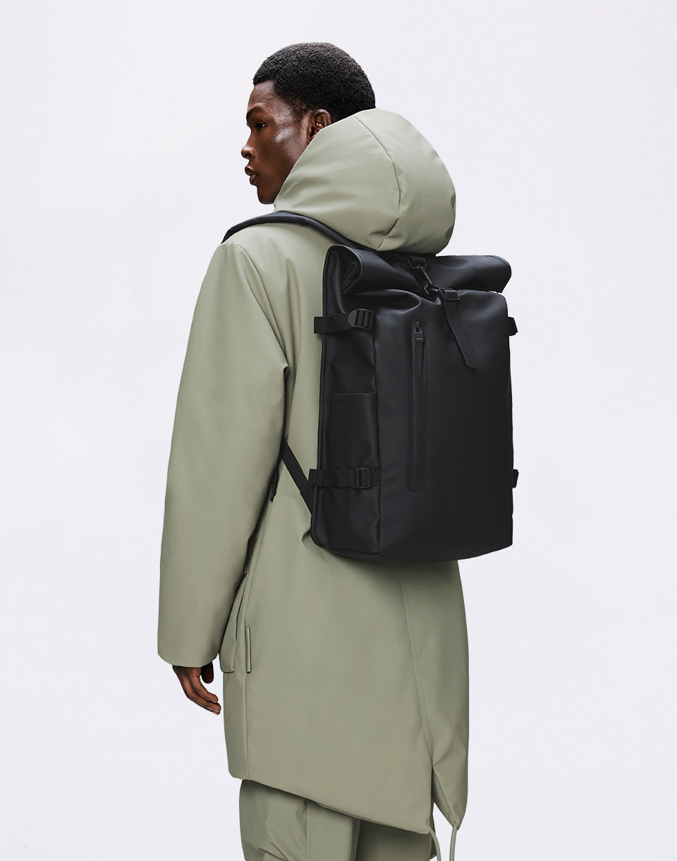 Rains Rolltop Rucksack Large W3 - an enlarged version of the iconic roll-top backpack from the Danish label, offering more volume, greater functionality and reliable rain protection for everyday movement around town and on the bike. Waterproof PU fabric material Rolling snap closure with carabiner One main compartment Front pocket with covered zipper Side pocket for 16" laptop with side access Two side open pockets Padded air mesh back Adjustable padded shoulder straps Adjustable chest strap Front D-ring for attaching bike lock Top handle for hand carry Water column: 8000 mm Dimensions: 63 × 32 × 14 cm Volume: 28 l Weight: 870 g Material: 100% polyester with PU coating