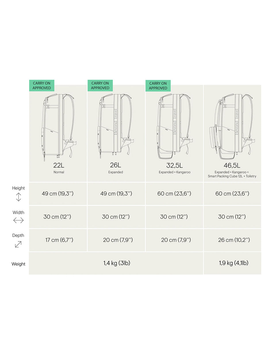 - Volume: 22 - 32,5 L (jusqu'à 46,5 L avec des accessoires supplémentaires)