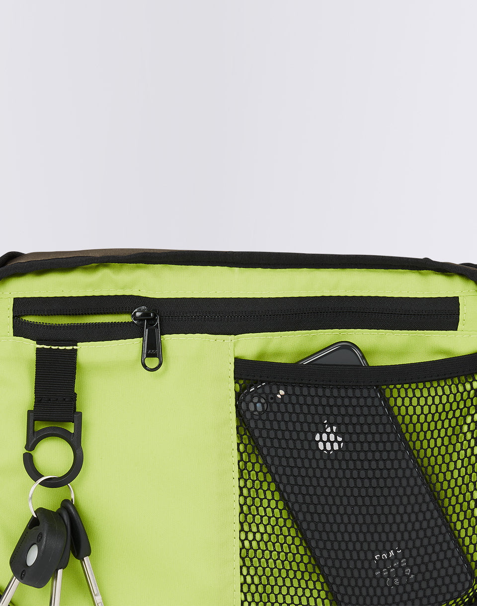 À l'intérieur d'une poche zippée et d'une poche en maille