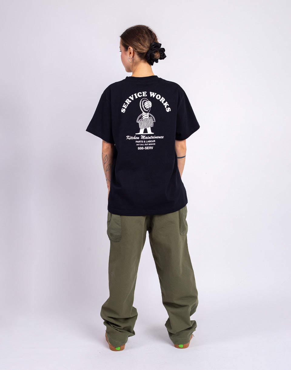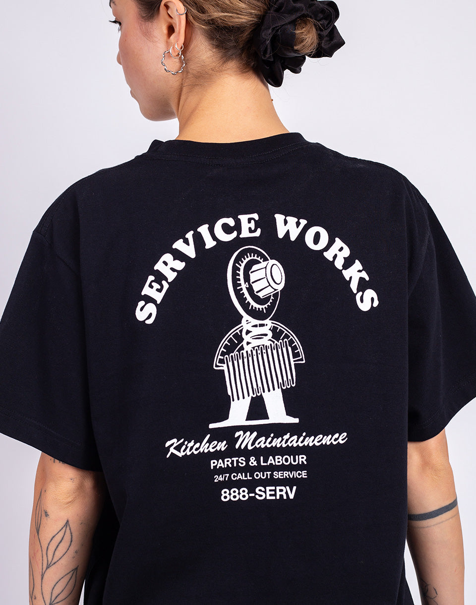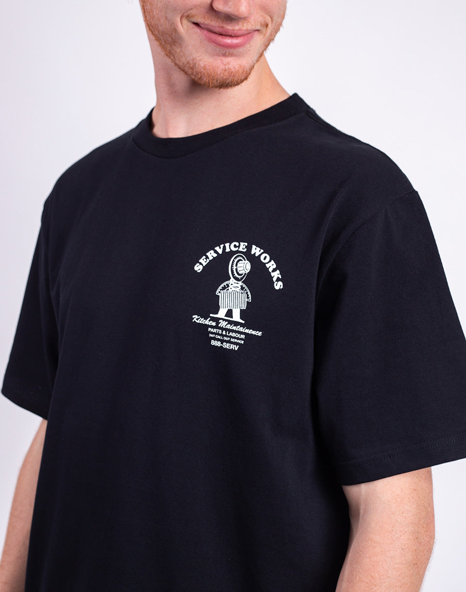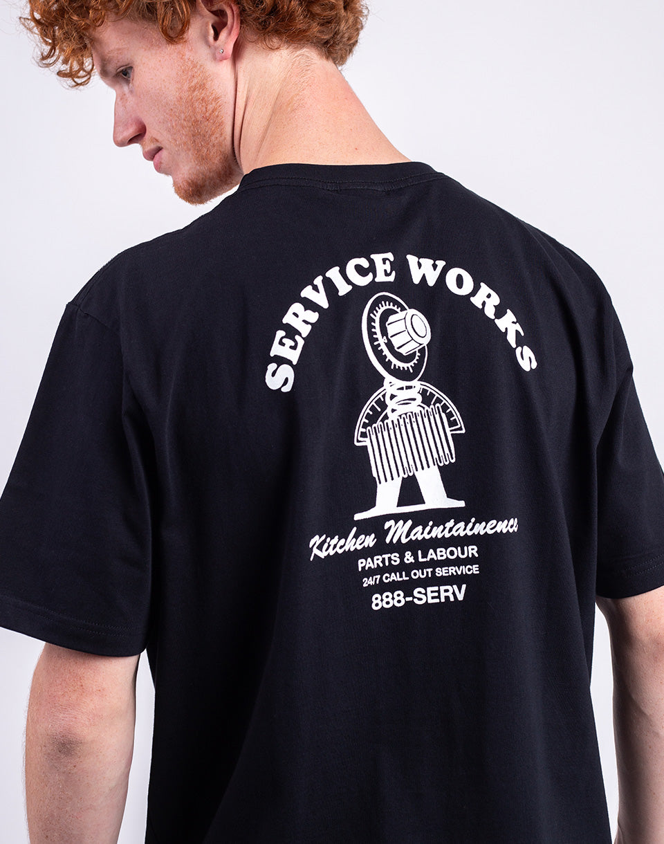 Service Works Maintainence Tee - a simple tee made from certified organic cotton with a small print on the chest and a large print on the back.