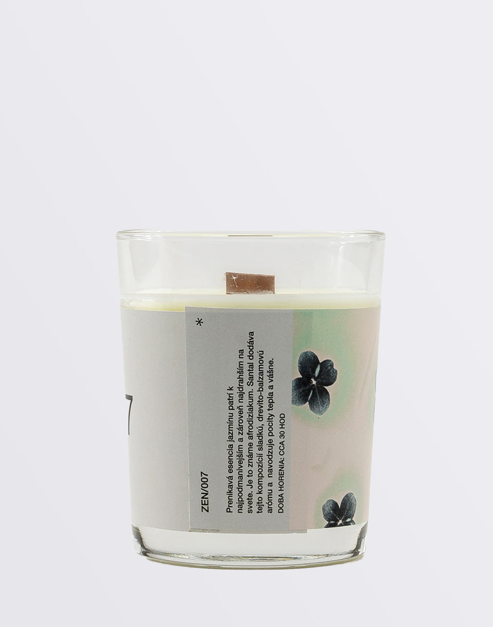 SO.SLOW 007 ZEN - Bougie de soja végétalienne coulée à la main avec une mèche en palissandre doucement fissurée. L'essence pénétrante du jasmin est un aphrodisiaque bien connu. Santal ajoute un arôme sucré et bassamique du bois et évoque des sentiments de chaleur et de passion.