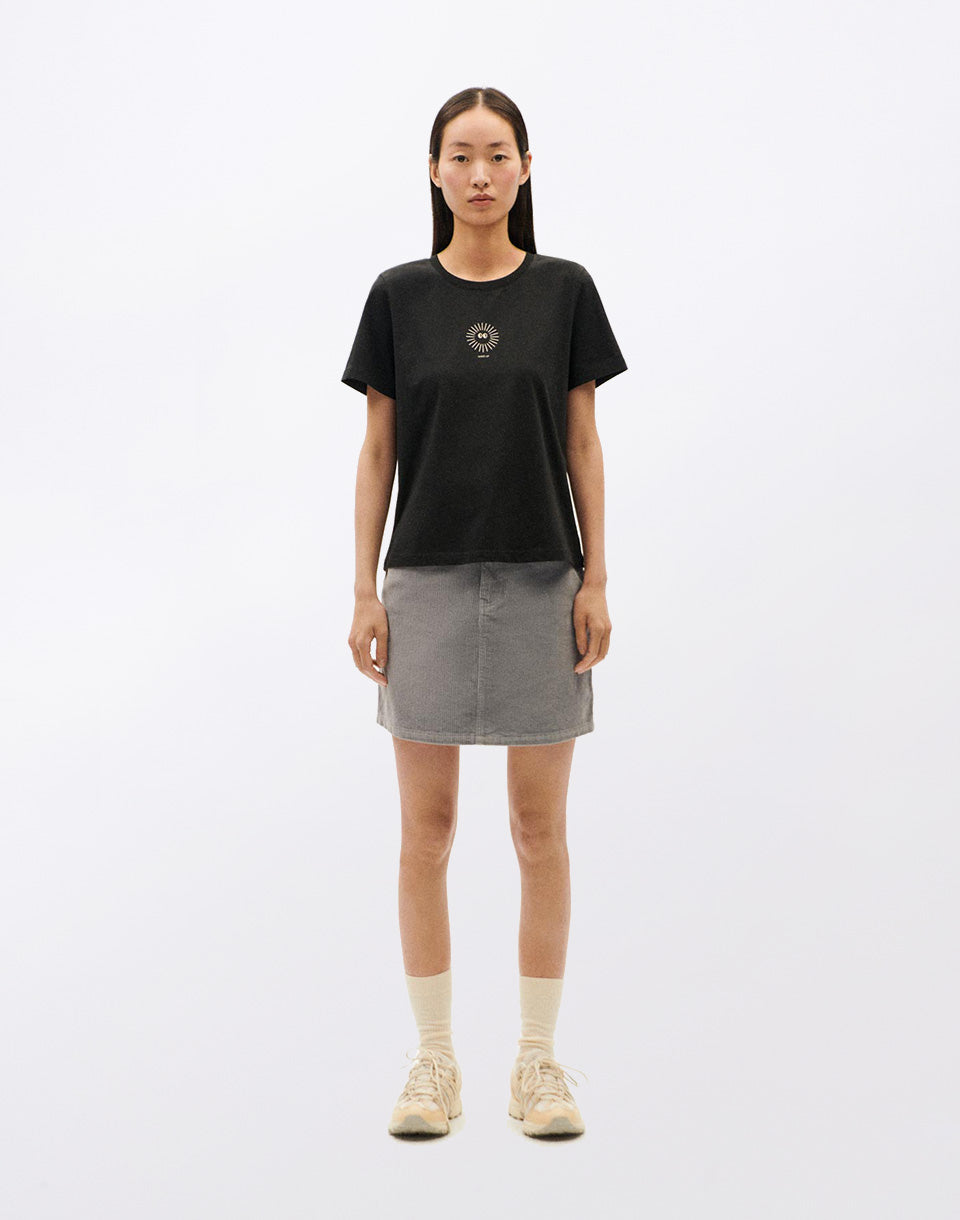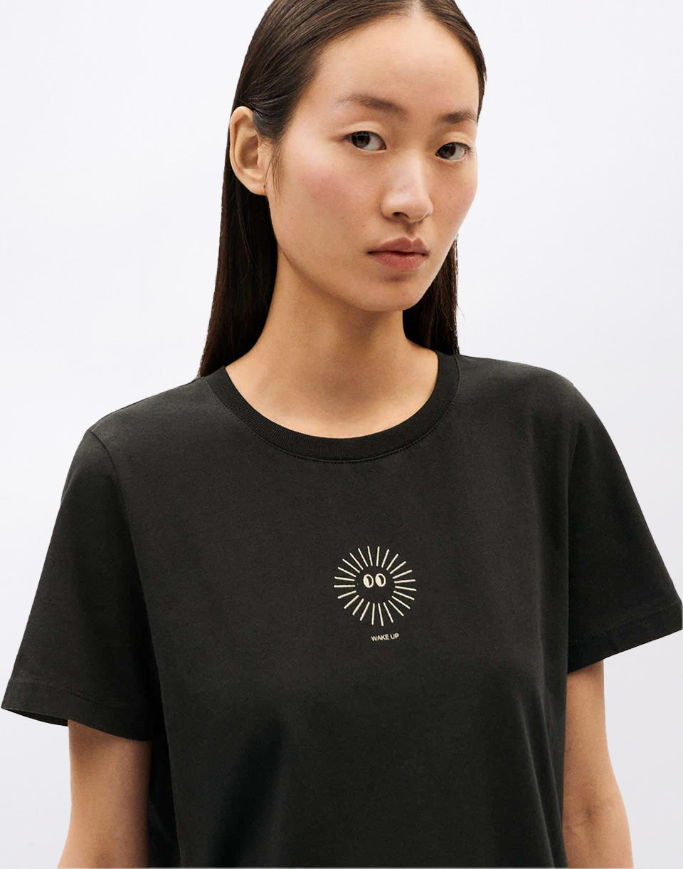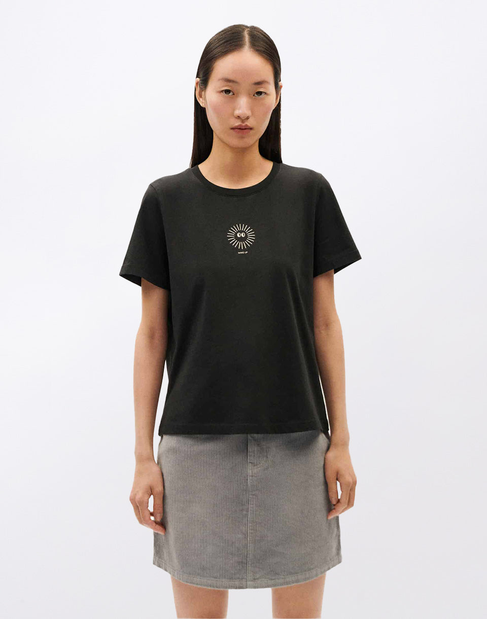 Pensant Mu Soleil Black Ida T-shirt - un t-shirt simple avec une petite impression sur la poitrine, qui plaira particulièrement confortable et de haute qualité en coton biologique avec certification GOTS.