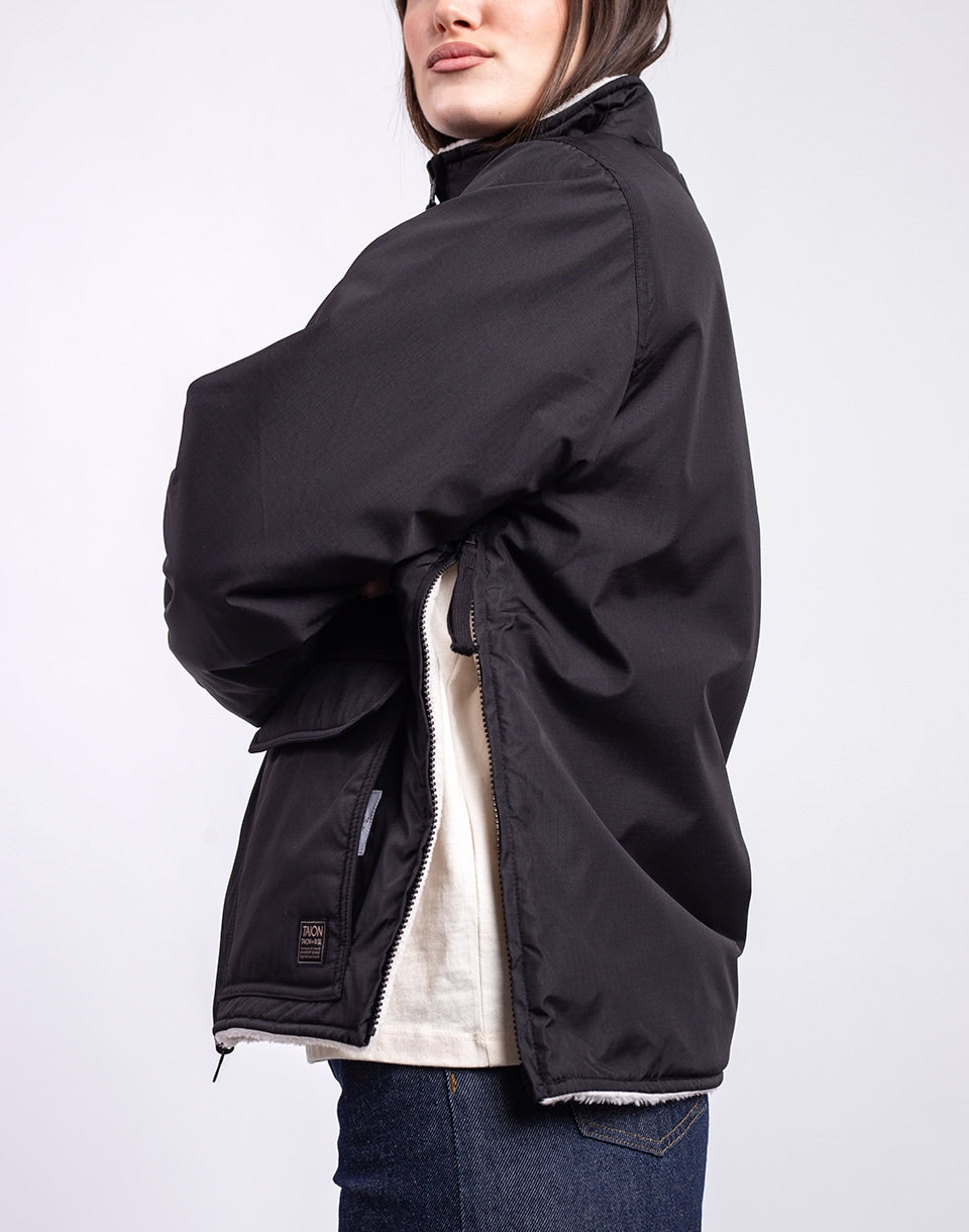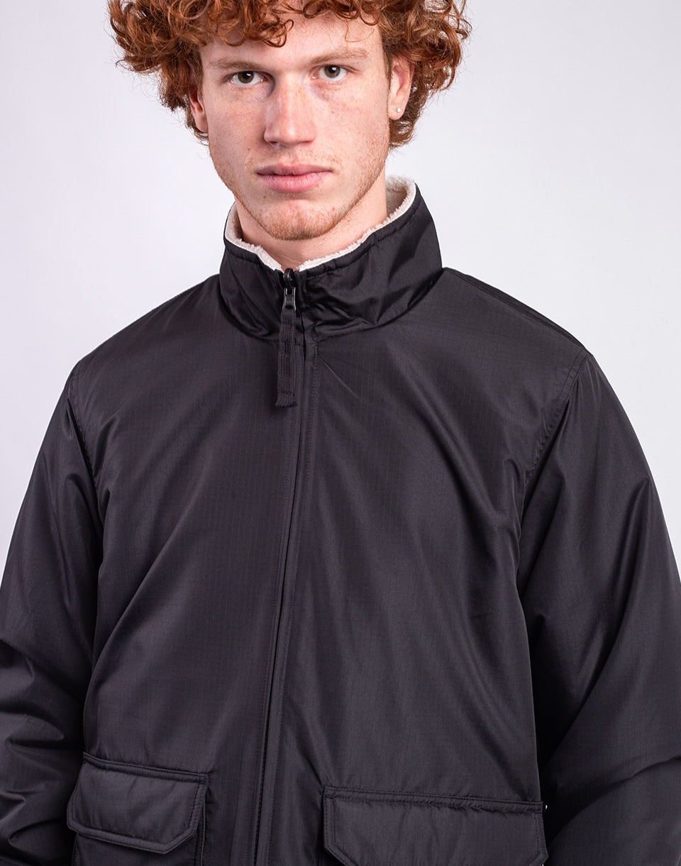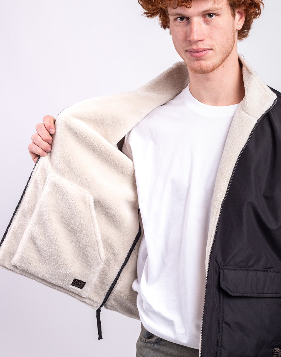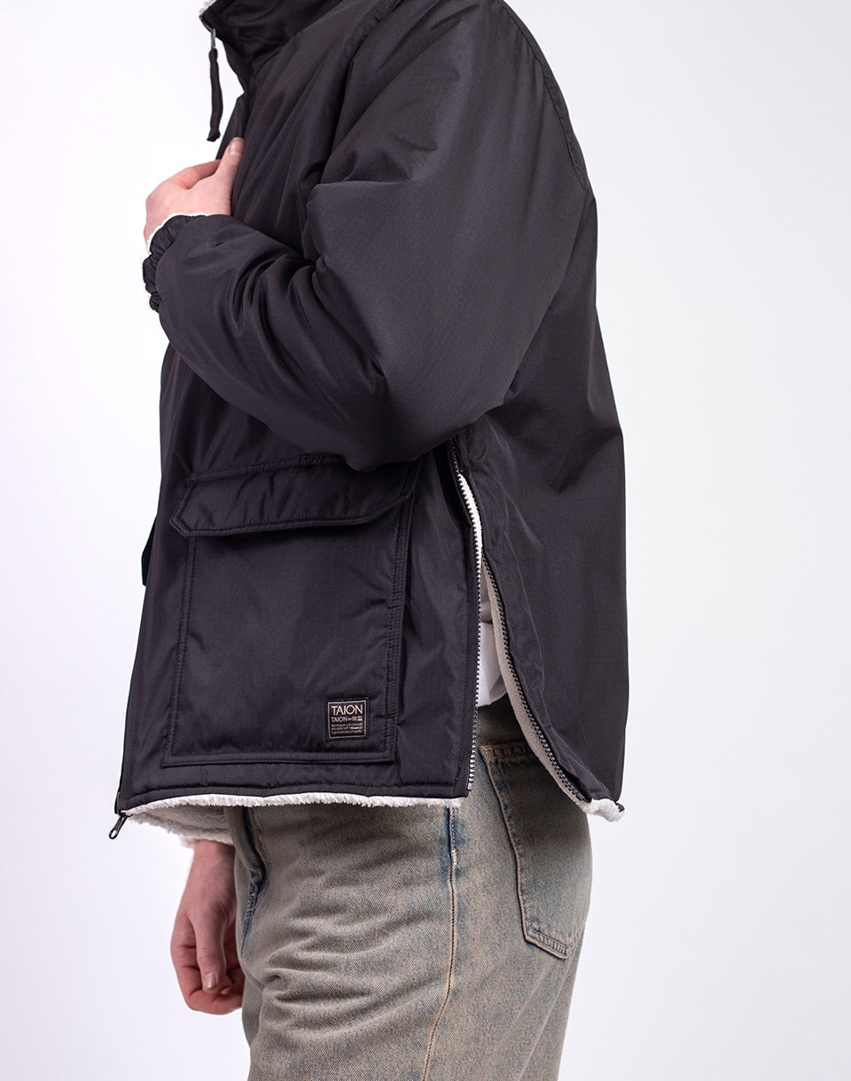 TAION Non Down Military Reversible Boa Hi Neck Jacket - a reversible jacket with a ripstop layer and a warm boa fleece that easily adjusts to the weather and layering thanks to a high collar and side zippers.