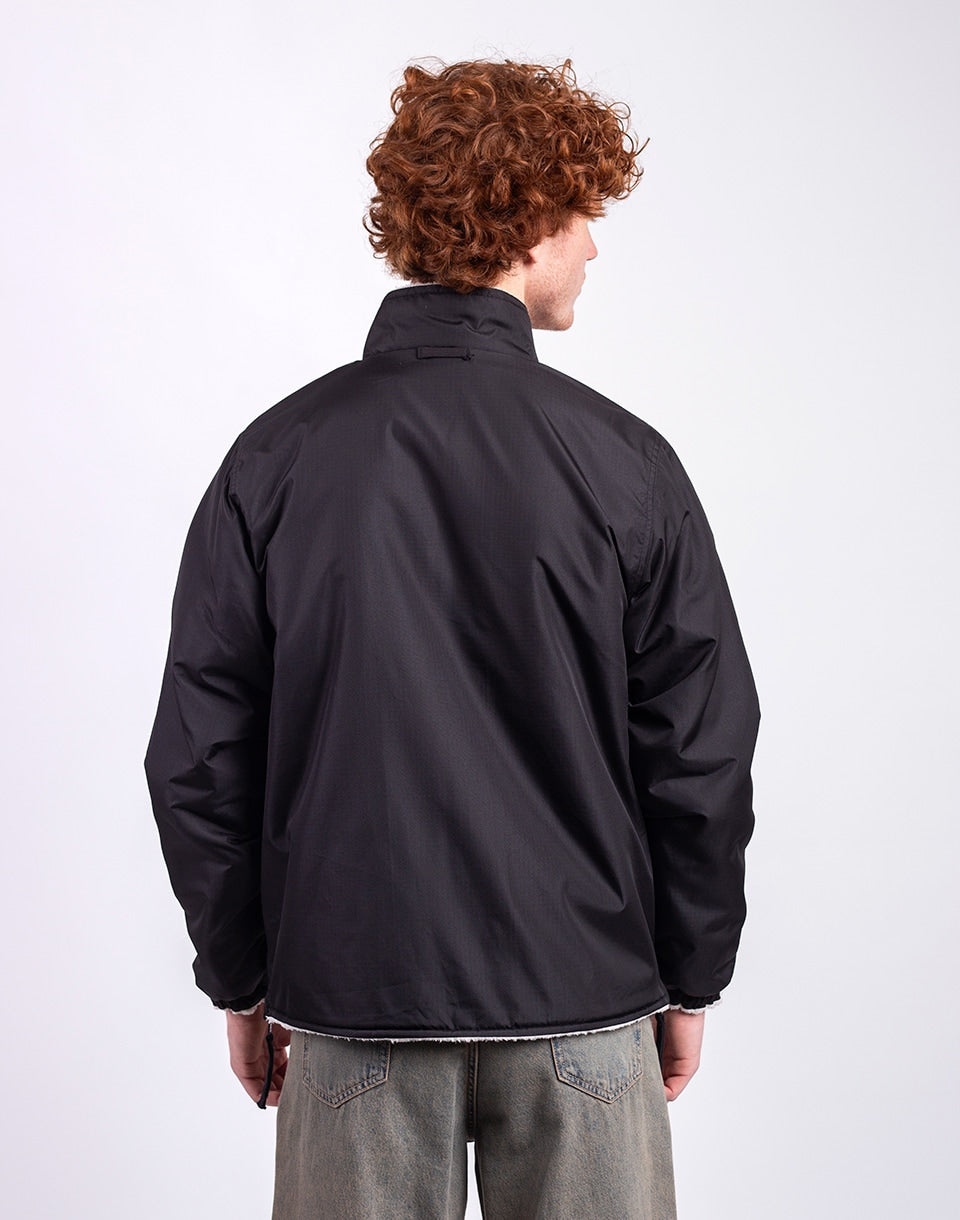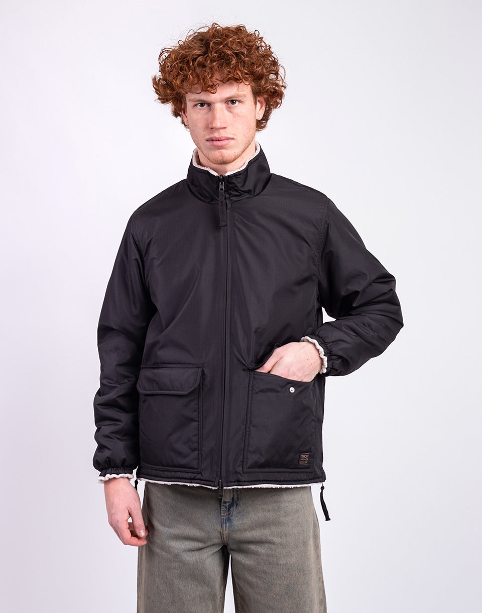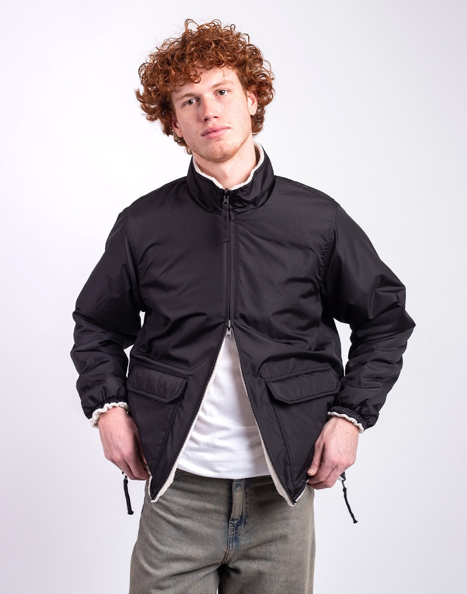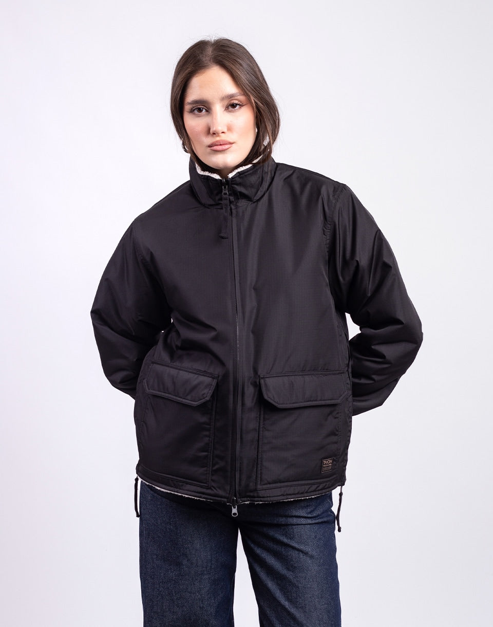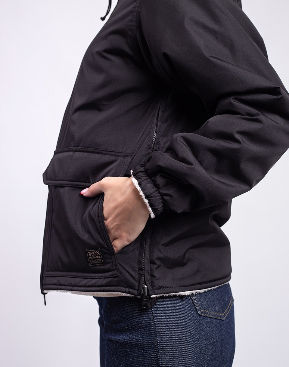 TAION Non Down Military Reversible Boa Hi Neck Jacket - a reversible jacket with a ripstop layer and a warm boa fleece that easily adjusts to the weather and layering thanks to a high collar and side zippers.