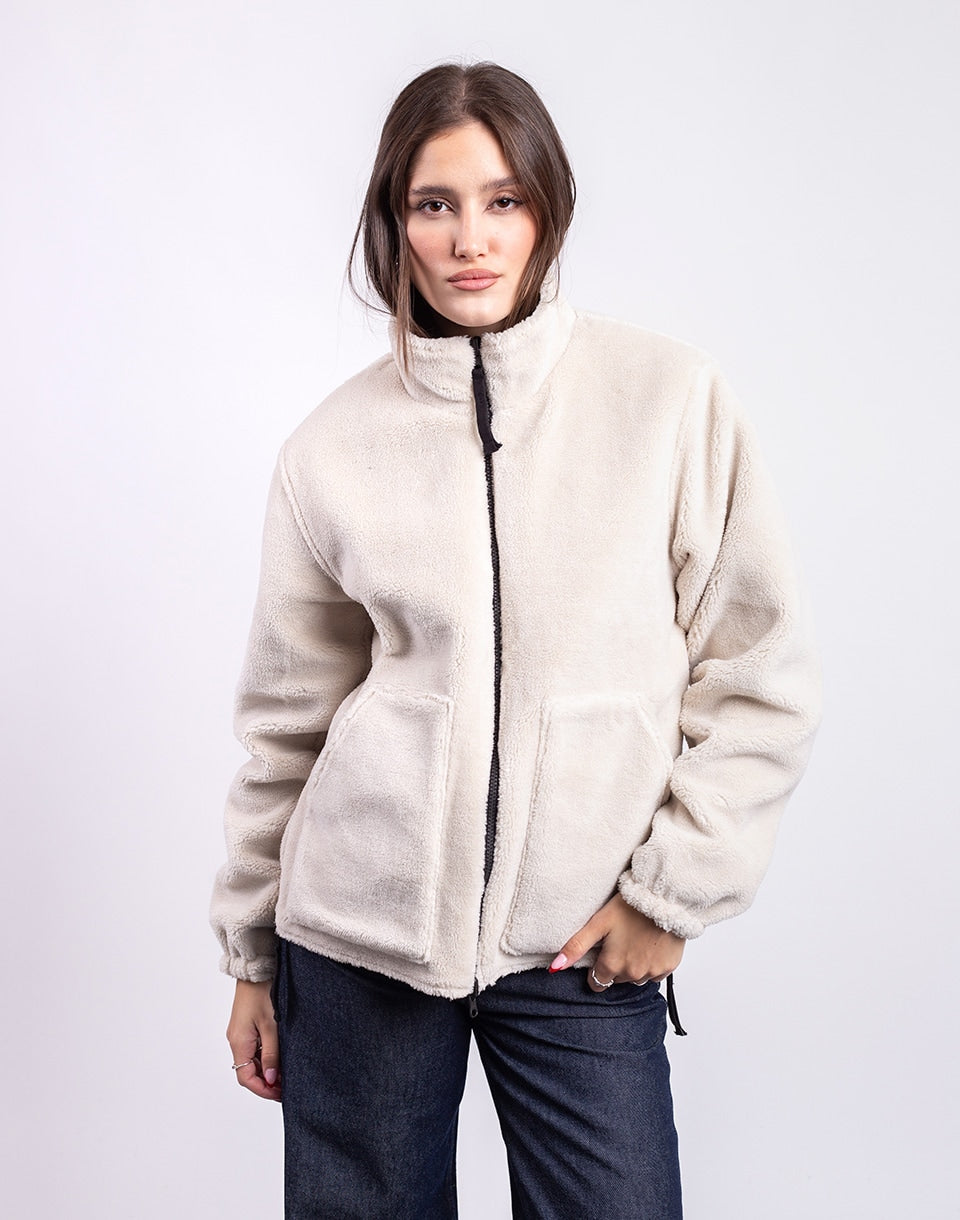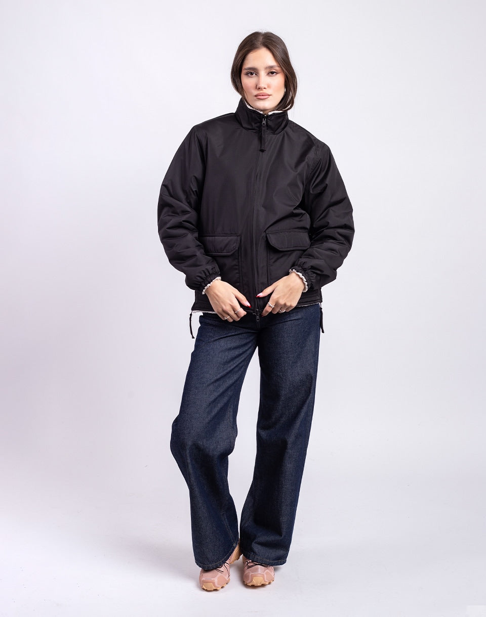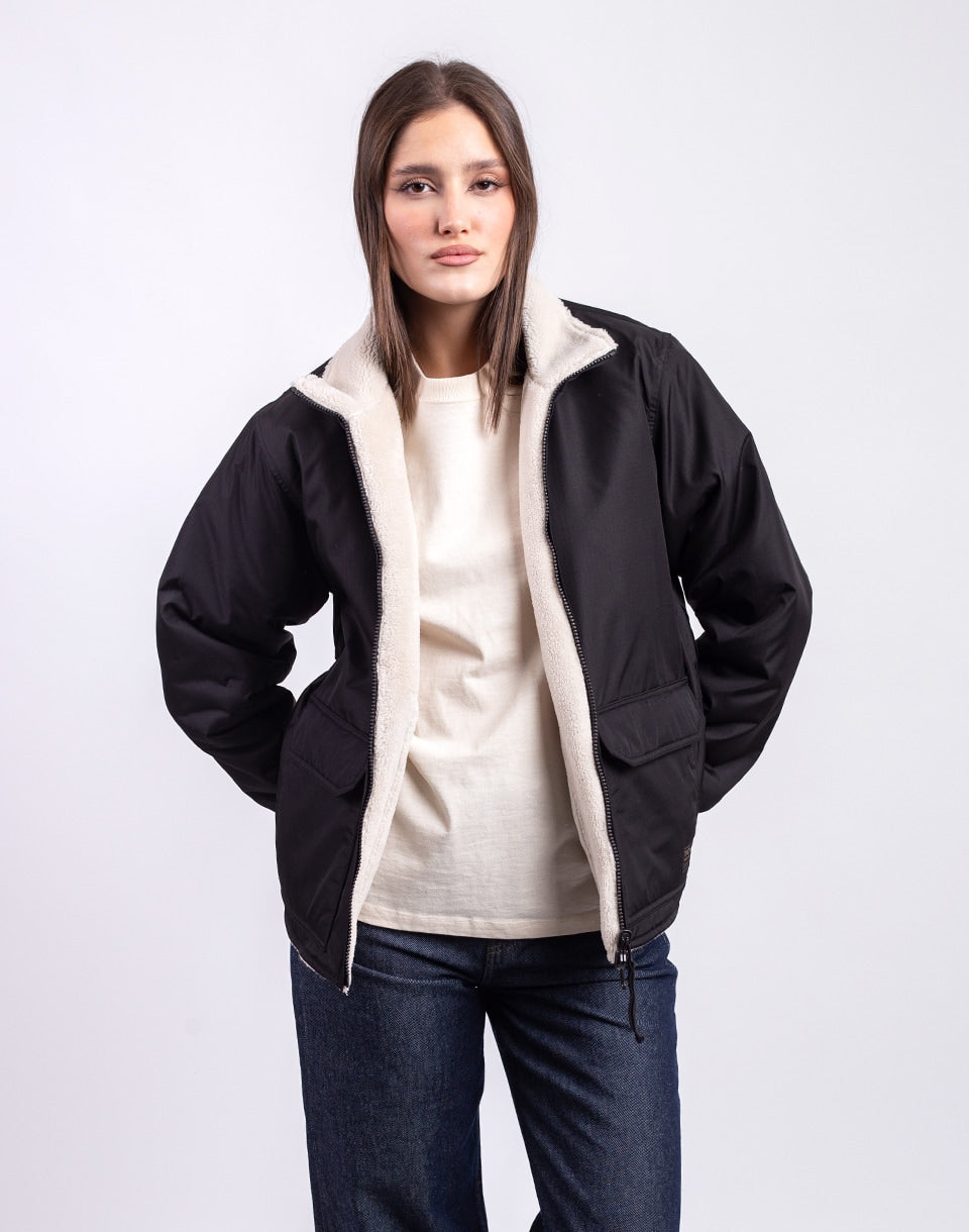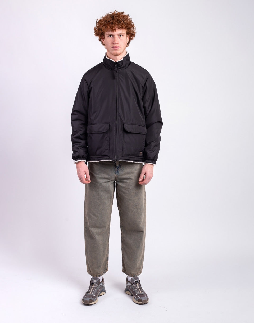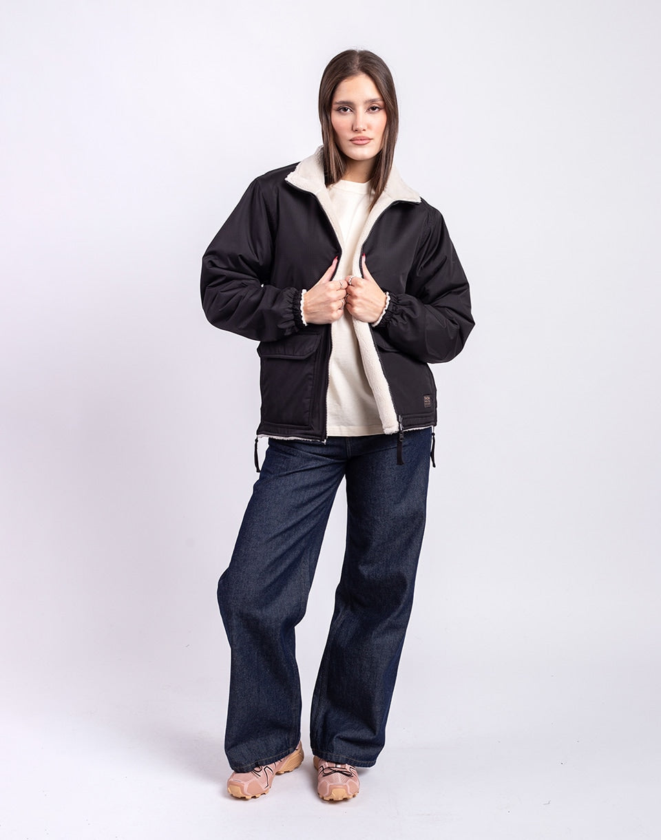 TAION Non Down Military Reversible Boa Hi Neck Jacket - a reversible jacket with a ripstop layer and a warm boa fleece that easily adjusts to the weather and layering thanks to a high collar and side zippers.