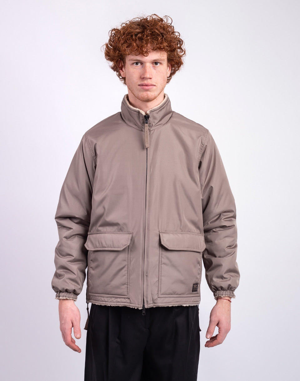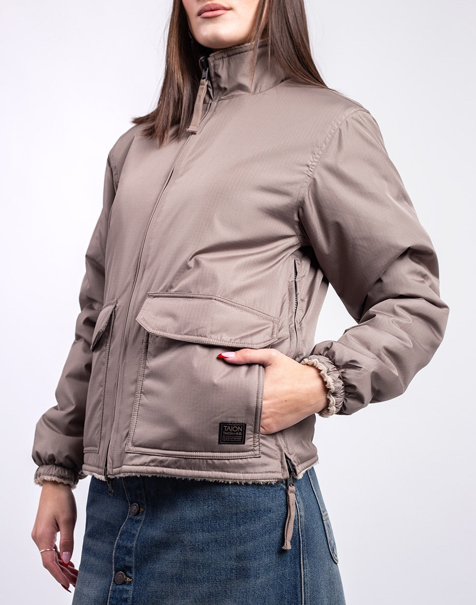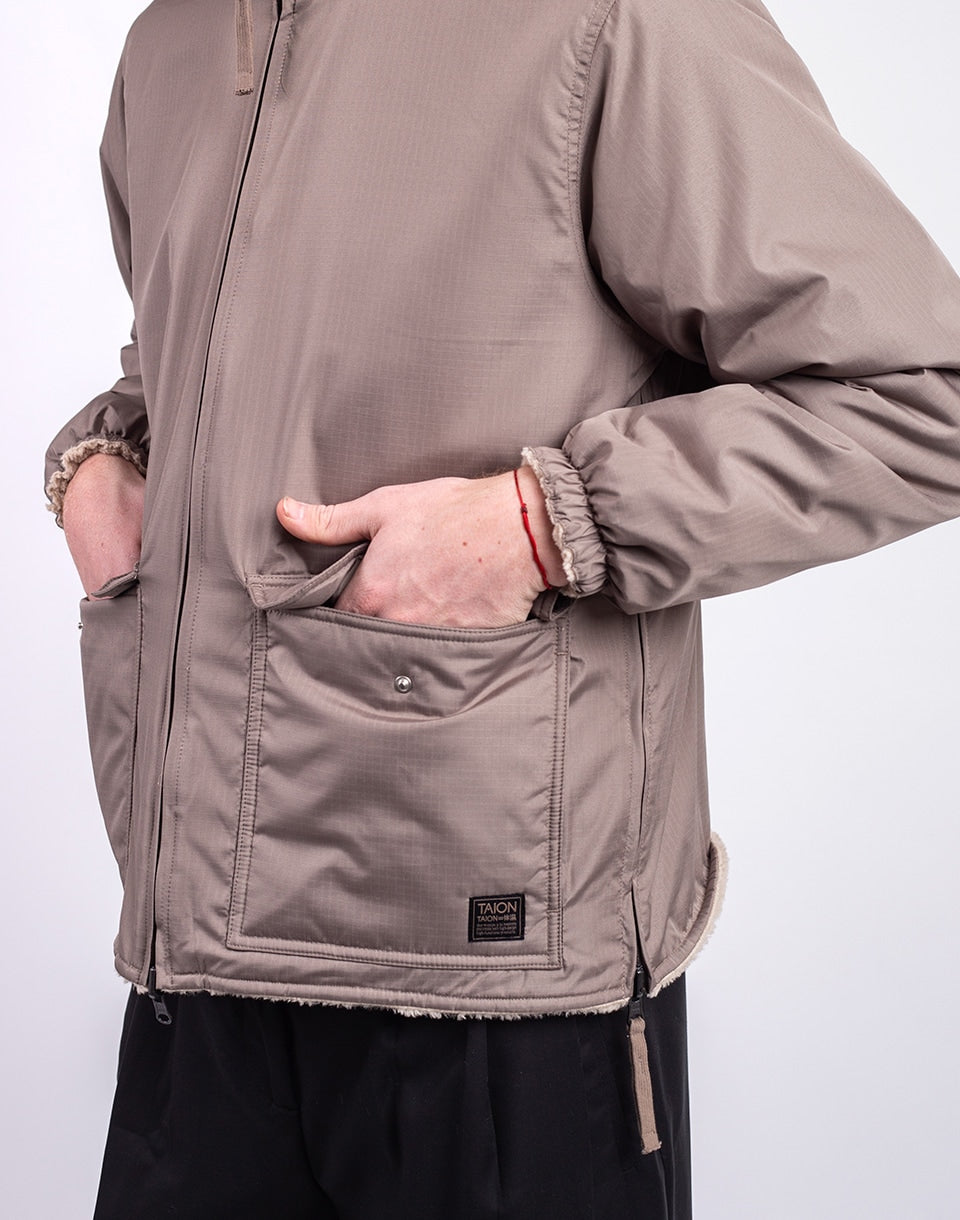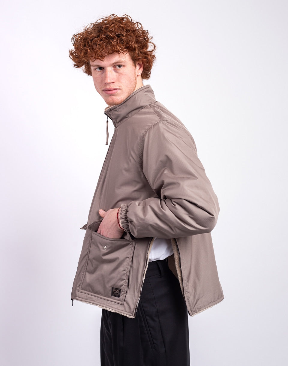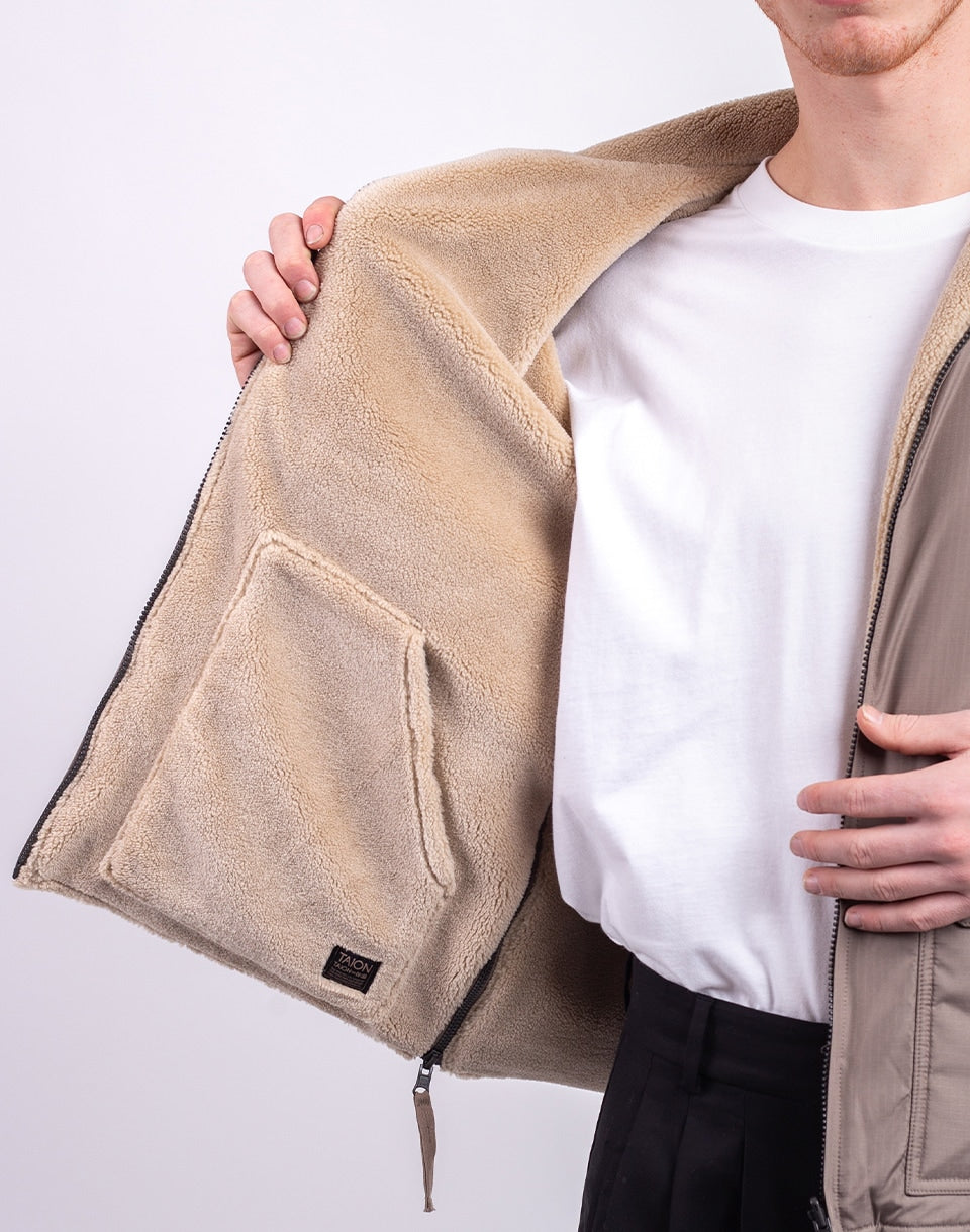 TAION Non Down Military Reversible Boa Hi Neck Jacket - a reversible jacket with a ripstop layer and a warm boa fleece that easily adjusts to the weather and layering thanks to a high collar and side zippers.