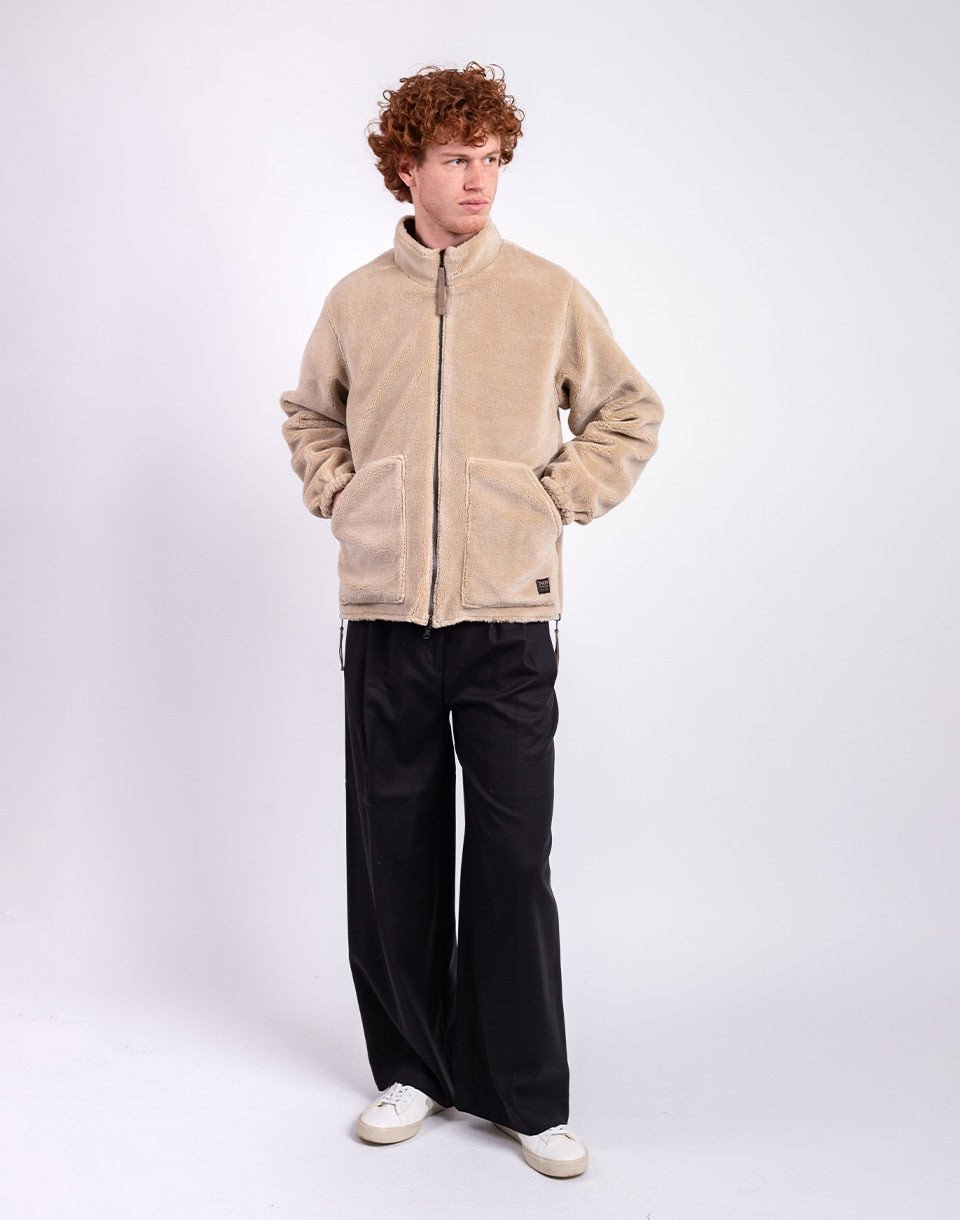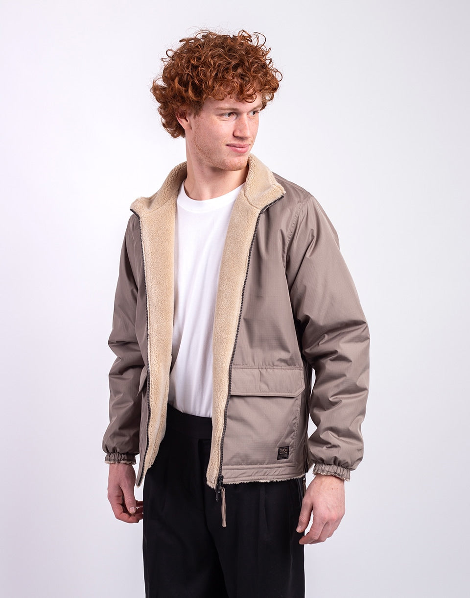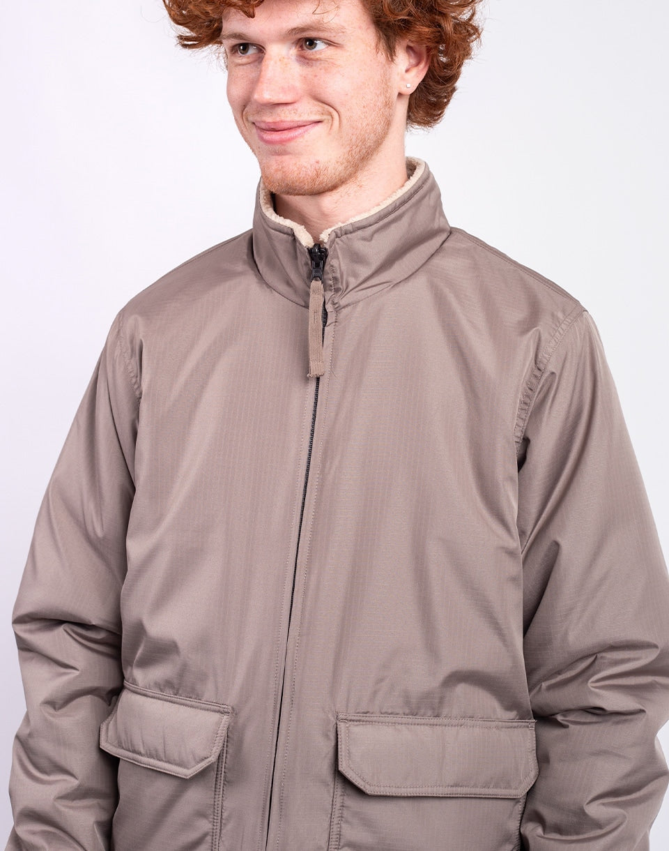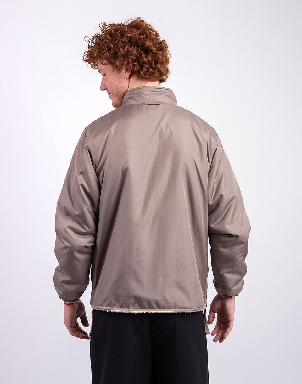 TAION Non Down Military Reversible Boa Hi Neck Jacket - a reversible jacket with a ripstop layer and a warm boa fleece that easily adjusts to the weather and layering thanks to a high collar and side zippers.