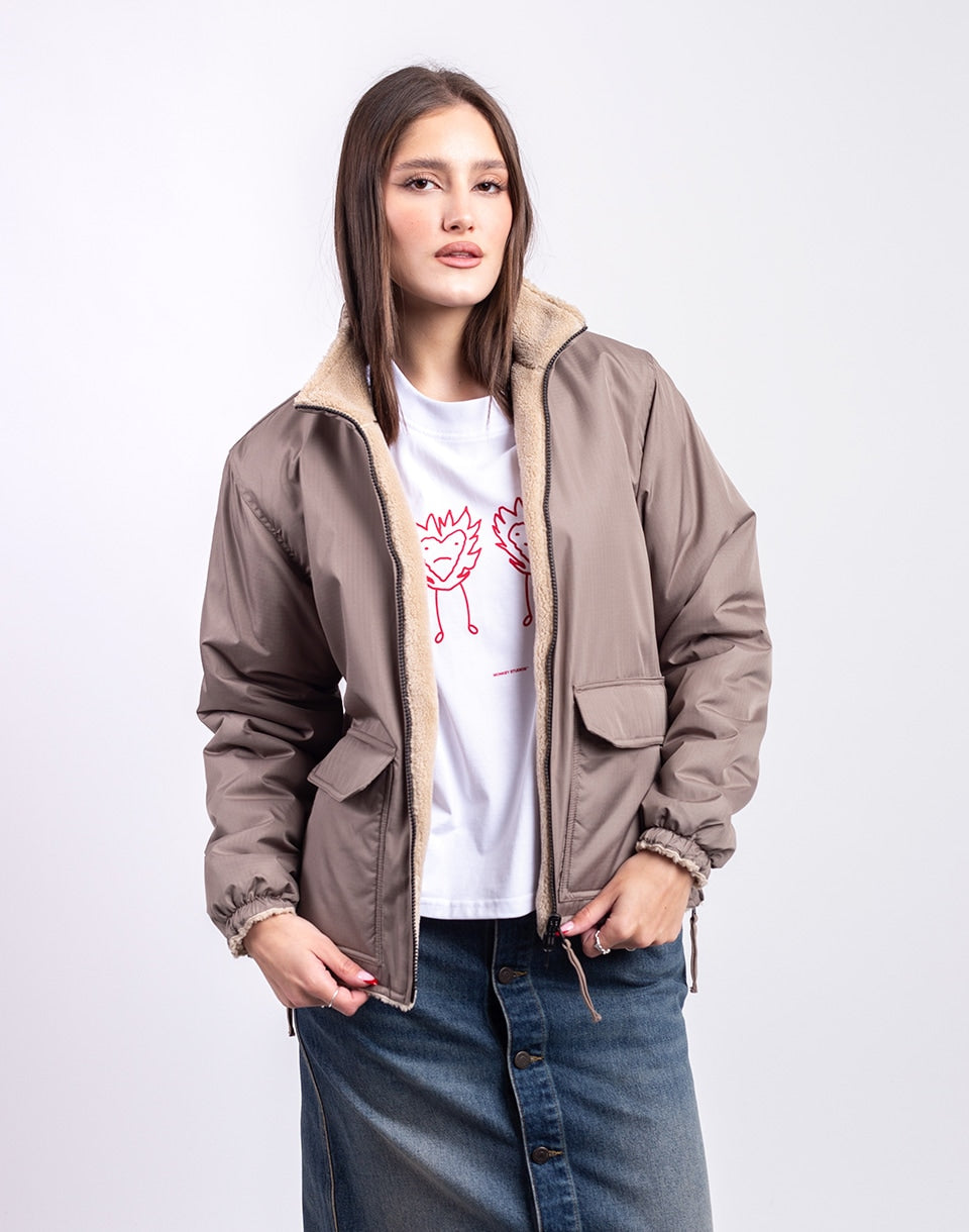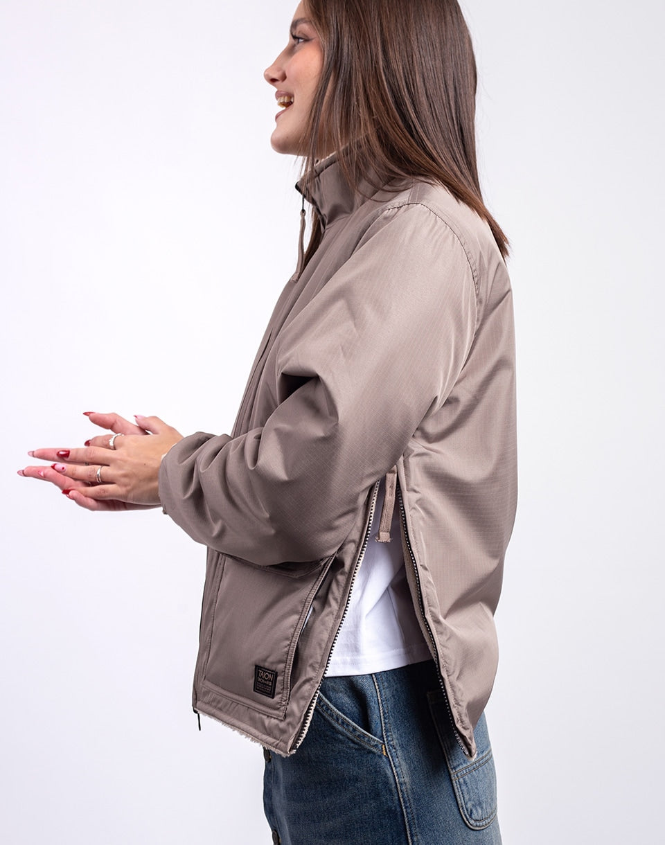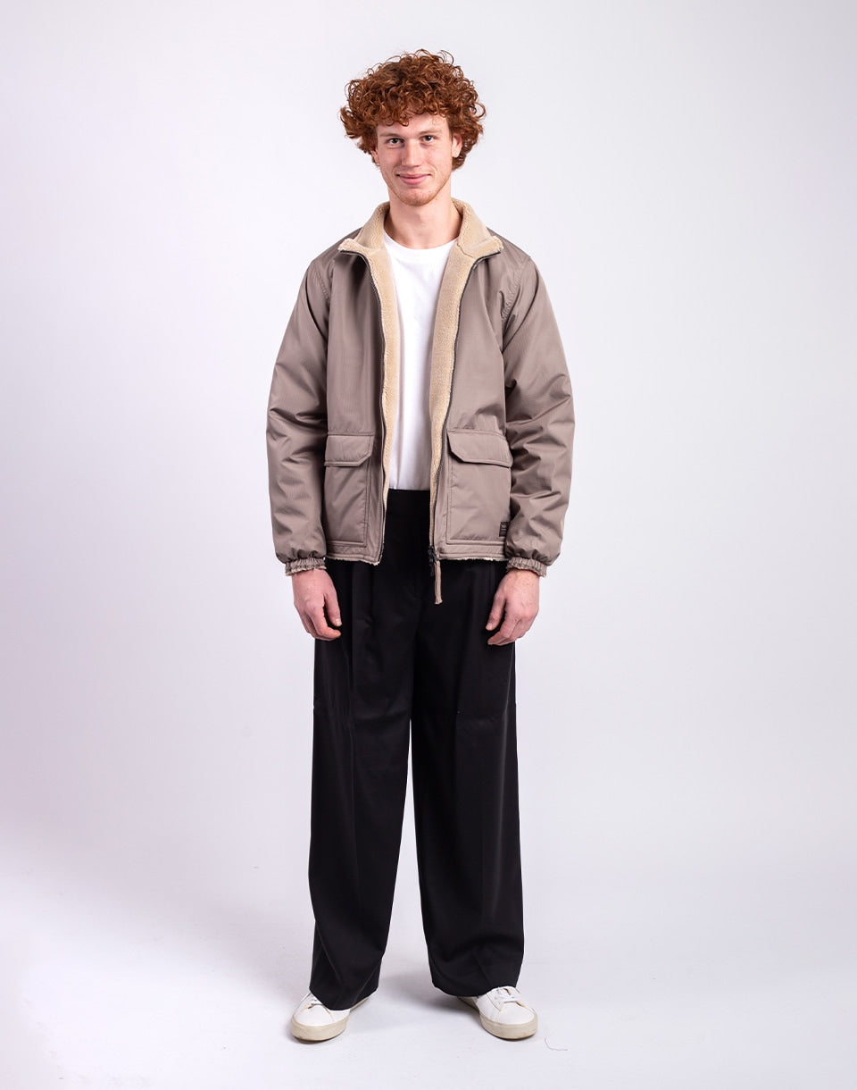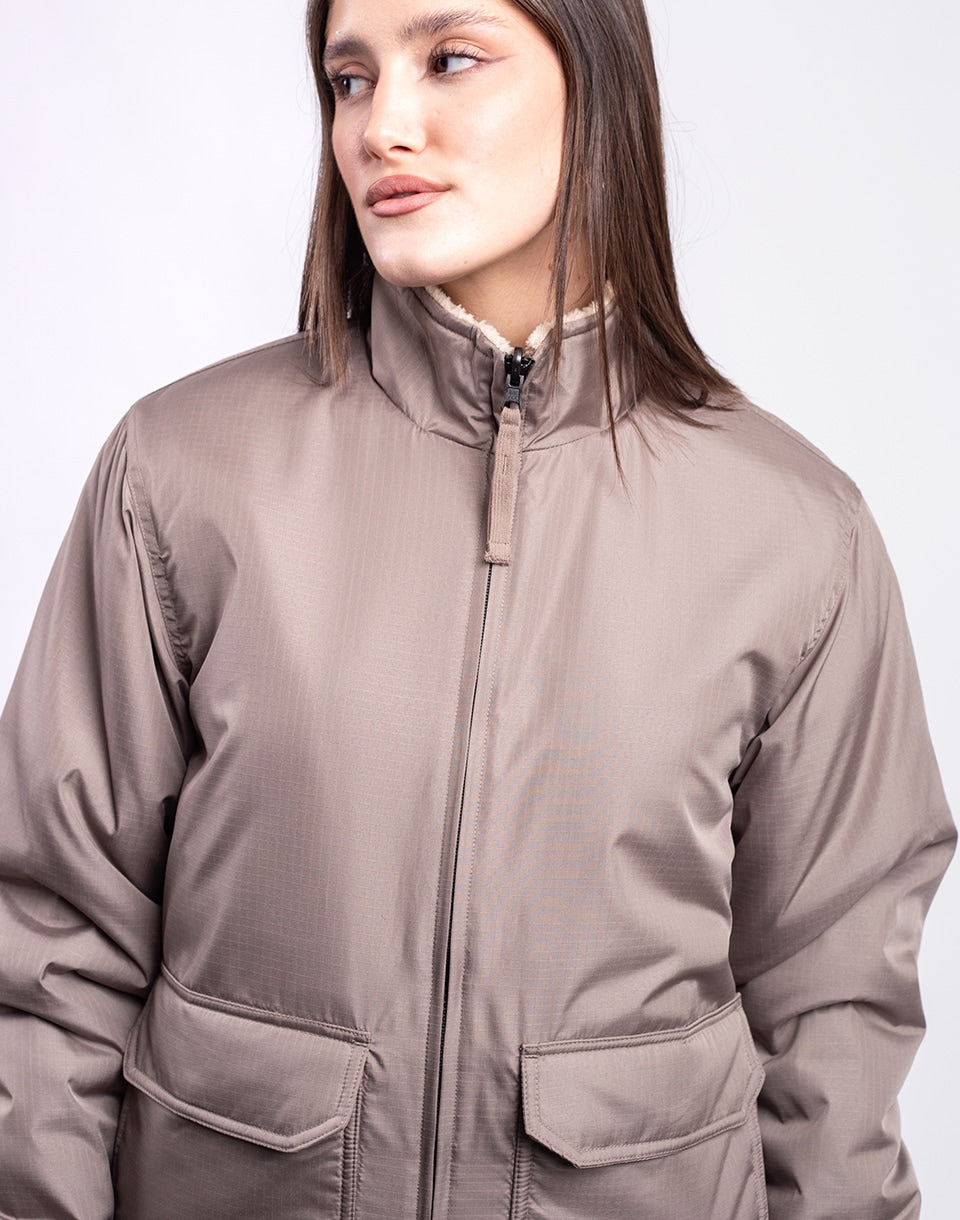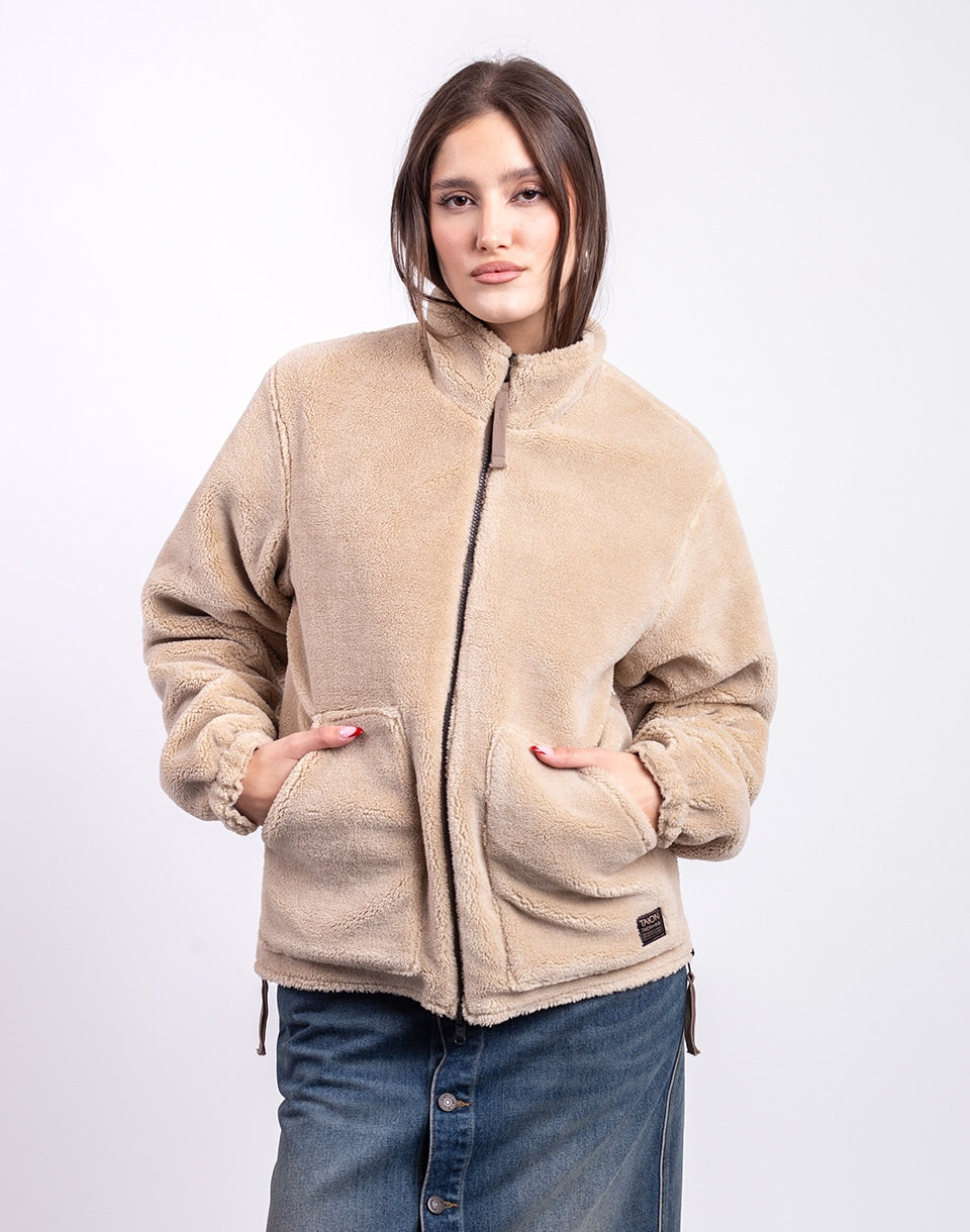 TAION Non Down Military Reversible Boa Hi Neck Jacket - a reversible jacket with a ripstop layer and a warm boa fleece that easily adjusts to the weather and layering thanks to a high collar and side zippers.