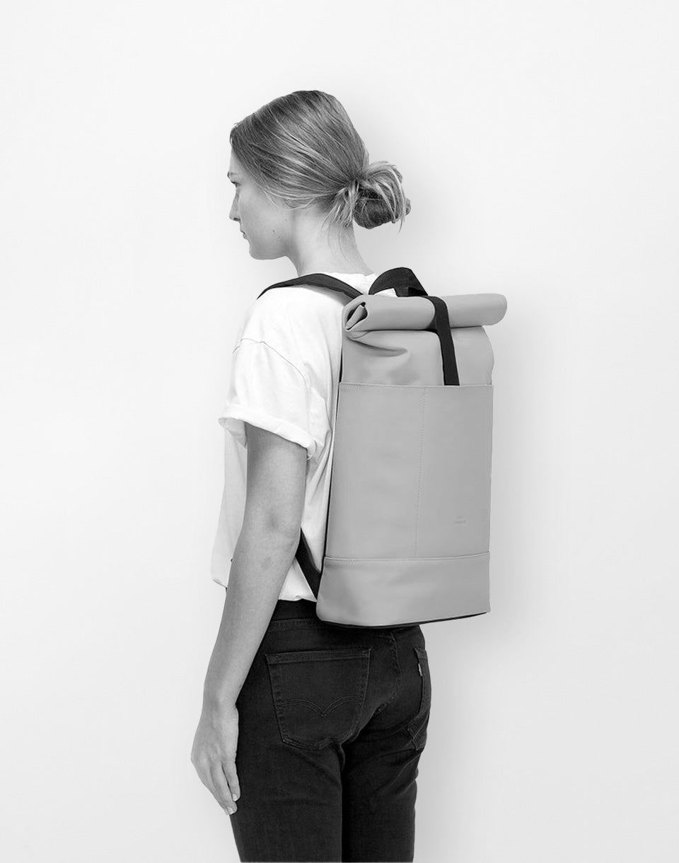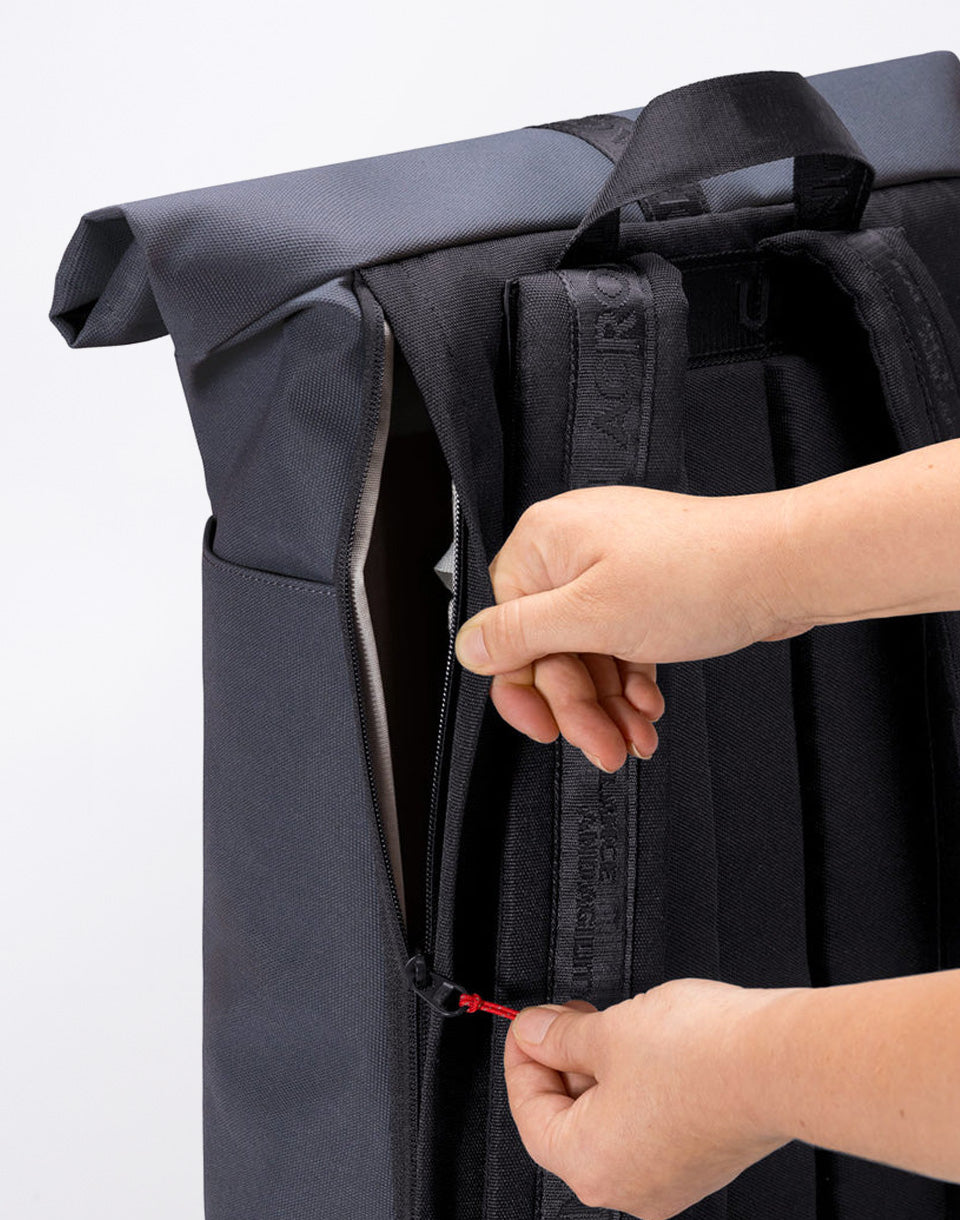 Ucon Acrobatics Hajo Medium – Sac à dos roll-top minimaliste de la collection unique Phantom, fabriqué à partir de bouteilles en PET recyclées et du matériau innovant ECO-RFLX-900, hautement réfléchissant grâce à la présence de microparticules de verre. Ce matériau offre aux cyclistes et aux piétons une sécurité accrue dans la circulation nocturne en ville.