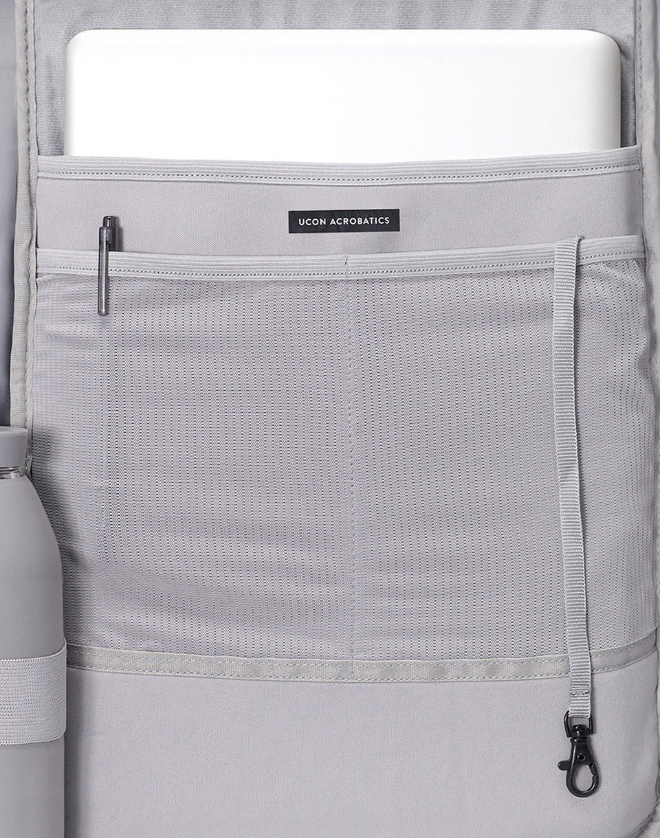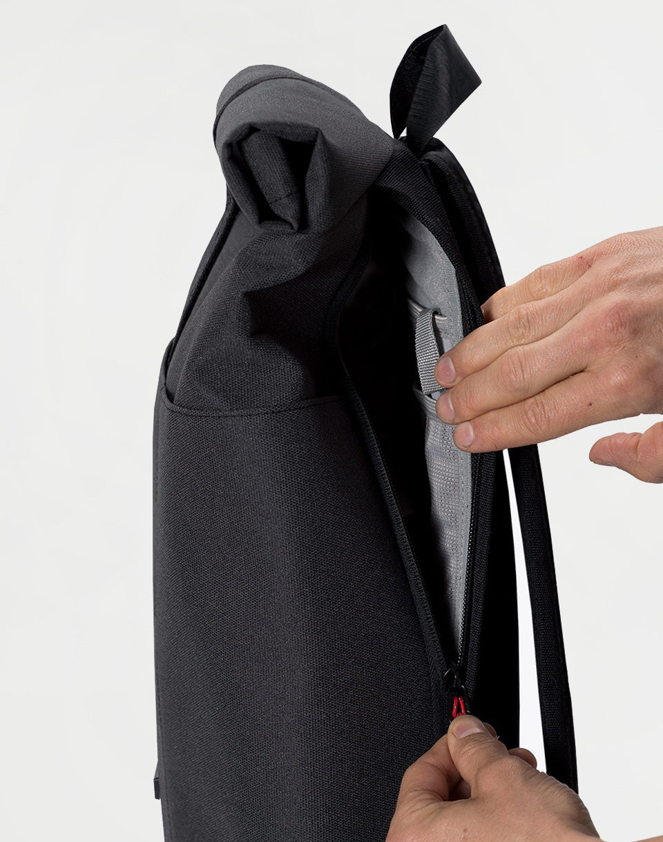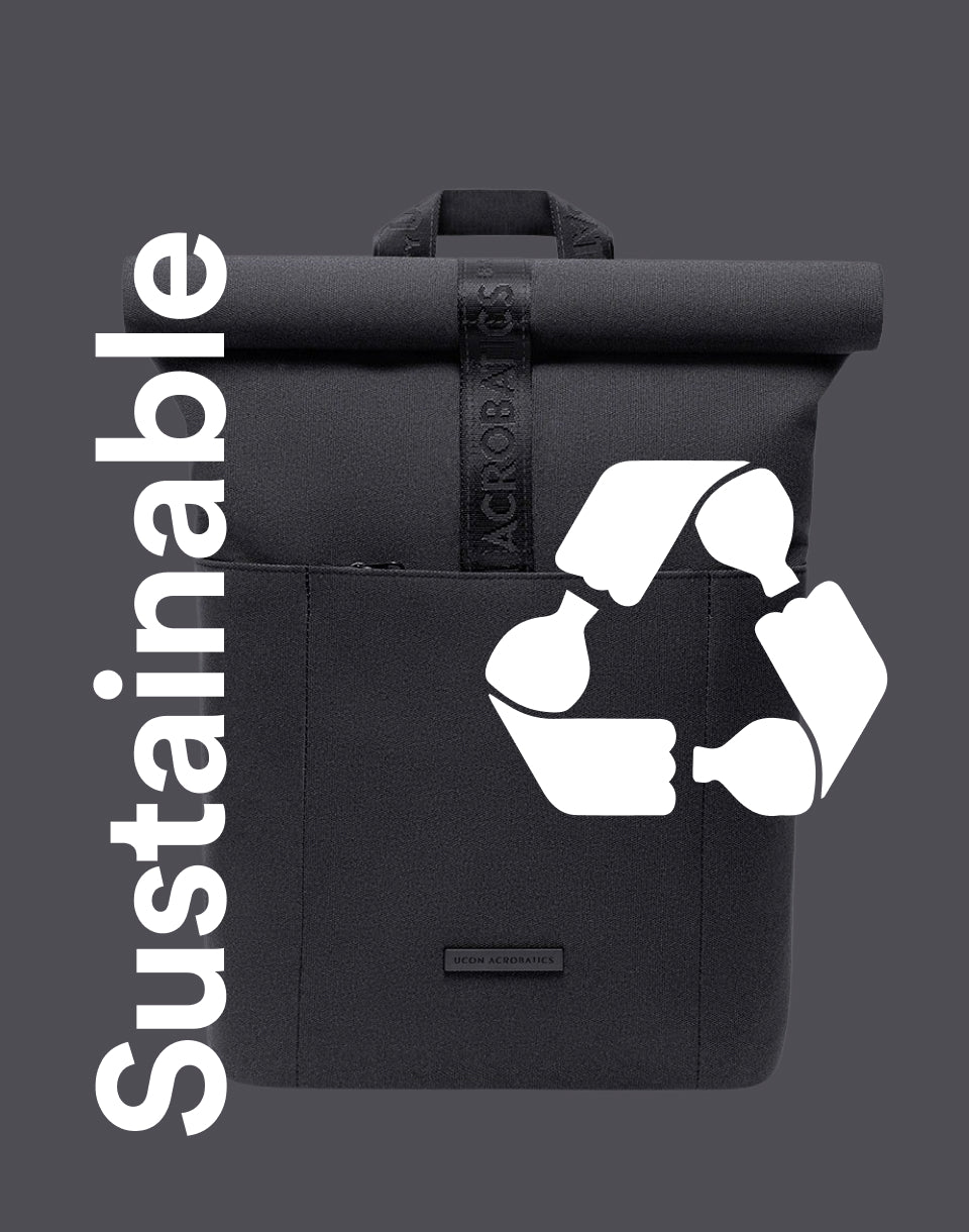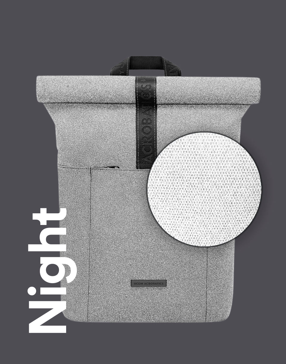 Ucon Acrobatics Hajo Mini – un petit sac à dos roll-top minimaliste de la collection unique Phantom, fabriqué à partir de bouteilles en PET recyclées et du matériau innovant ECO-RFLX-900, hautement réfléchissant grâce à la présence de microparticules de verre dans le tissu. Il offre aux cyclistes et aux piétons une sécurité accrue dans la circulation nocturne en ville.