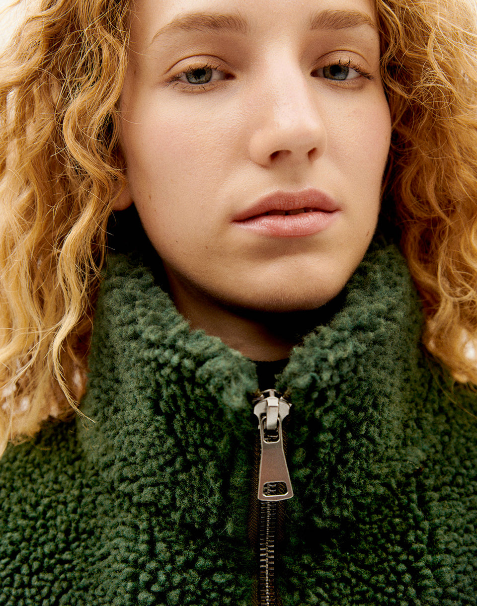 Penser à la veste Sophie à poubelle vert foncé - Veste de femmes confortables avec une coupe plus courte en fourrure synthétique en polyester recyclée.